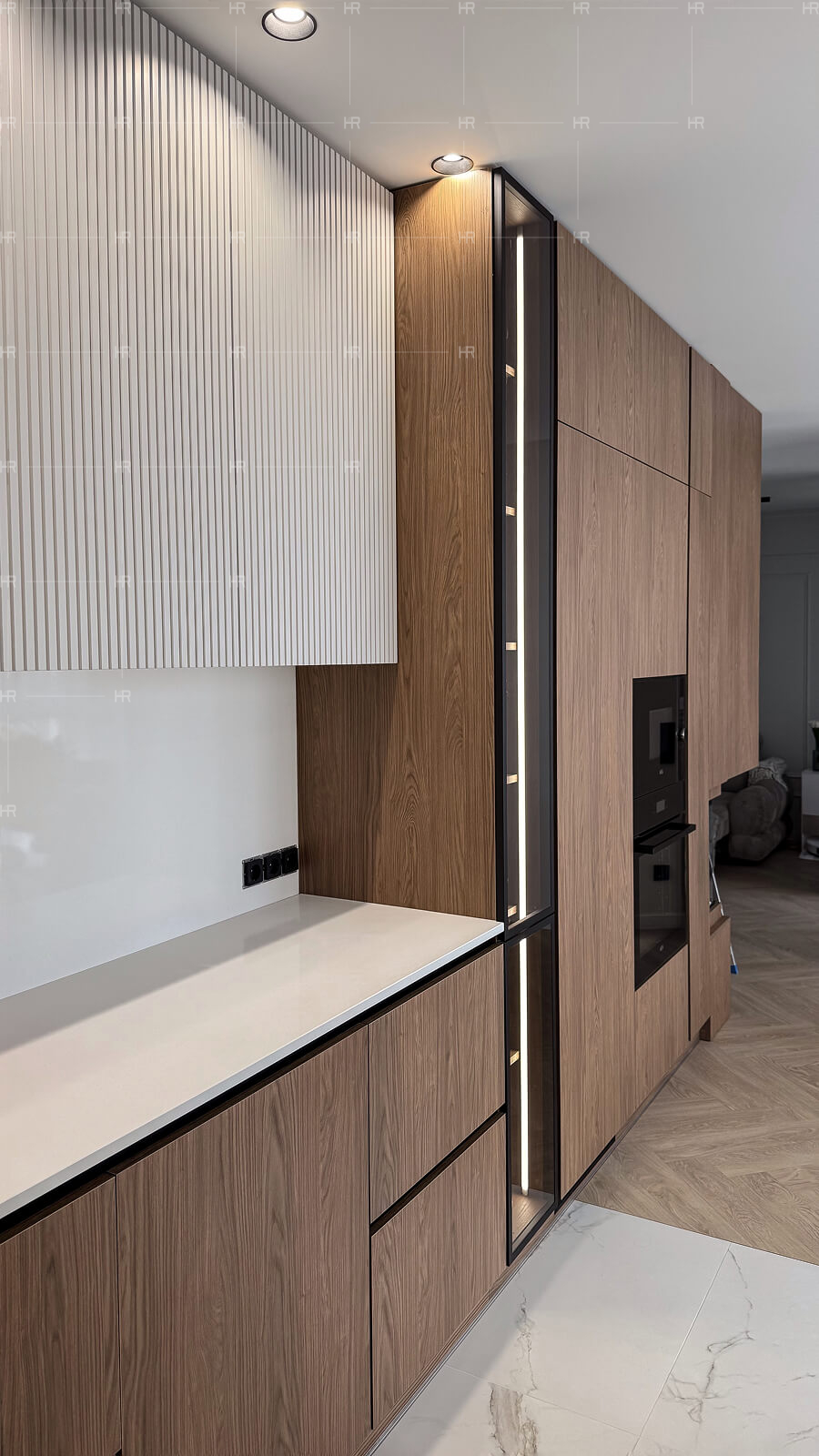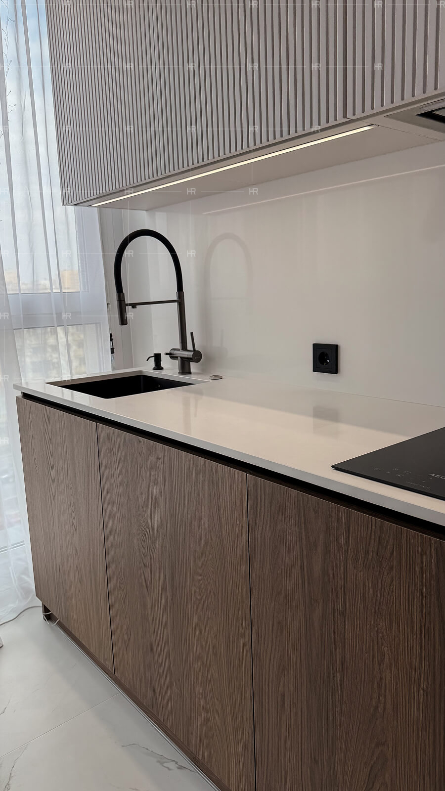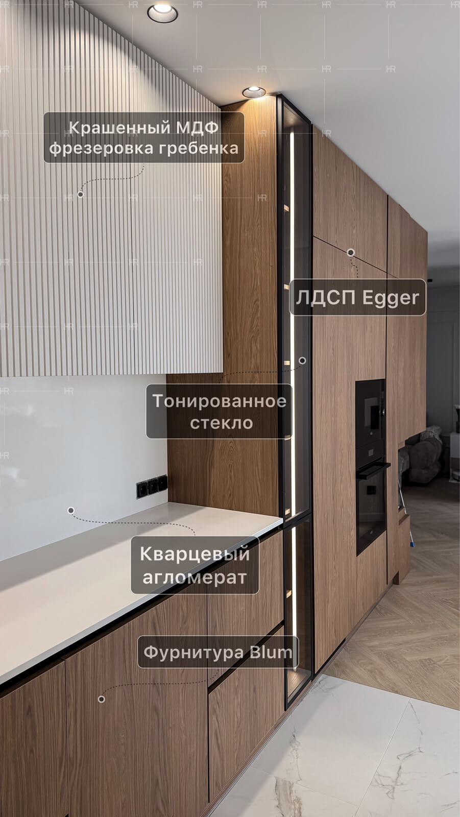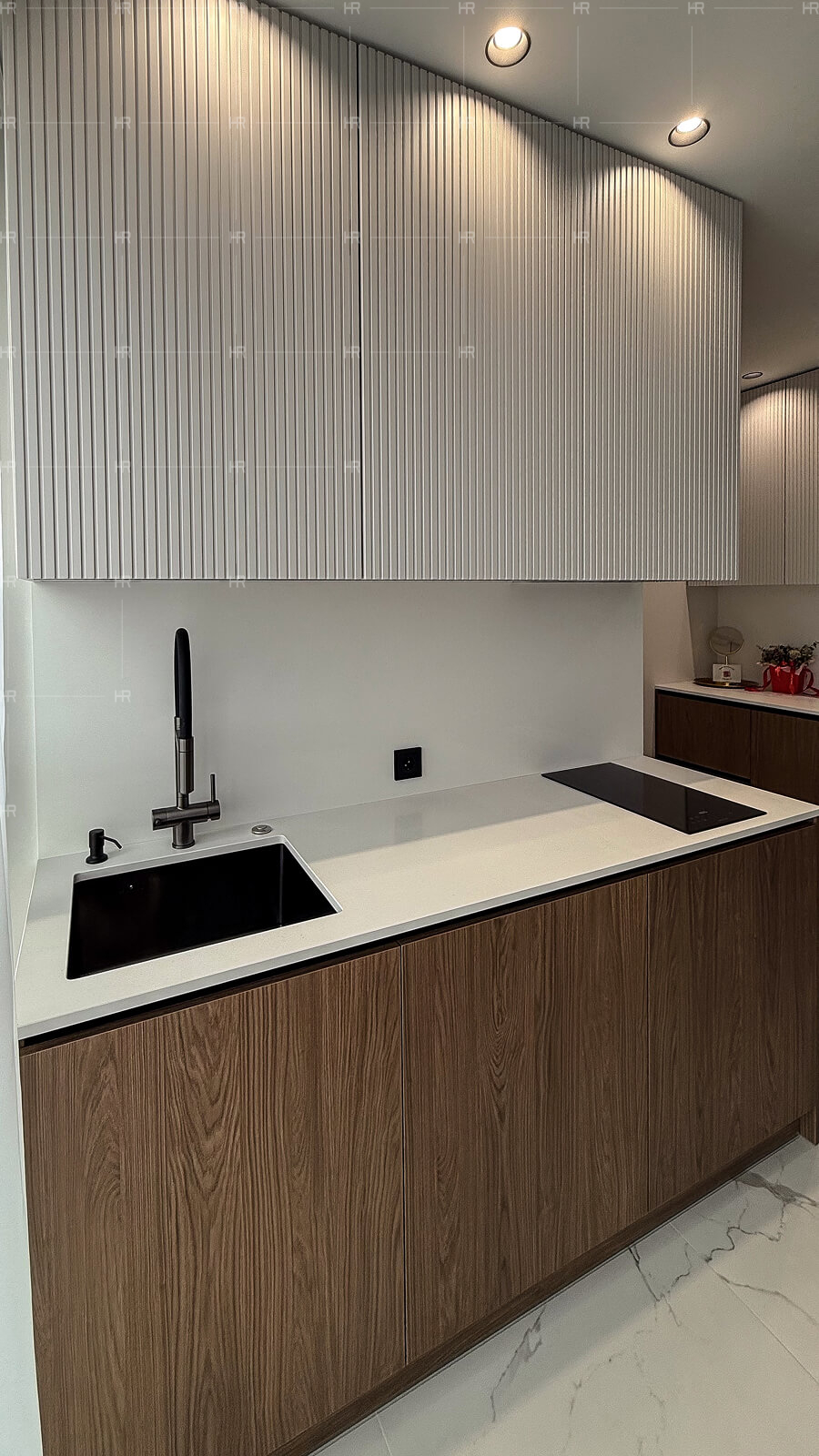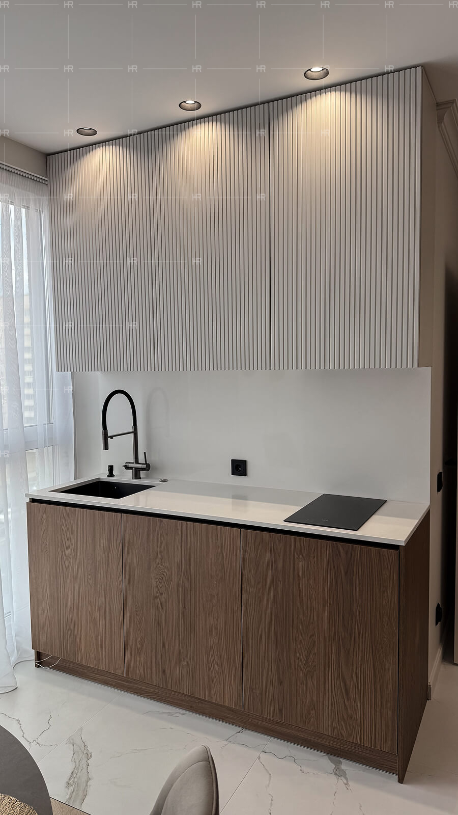- Подсветка. Шкафы и рабочую зону оснастили подсветкой, добавив удобства и зрительной лёгкости.