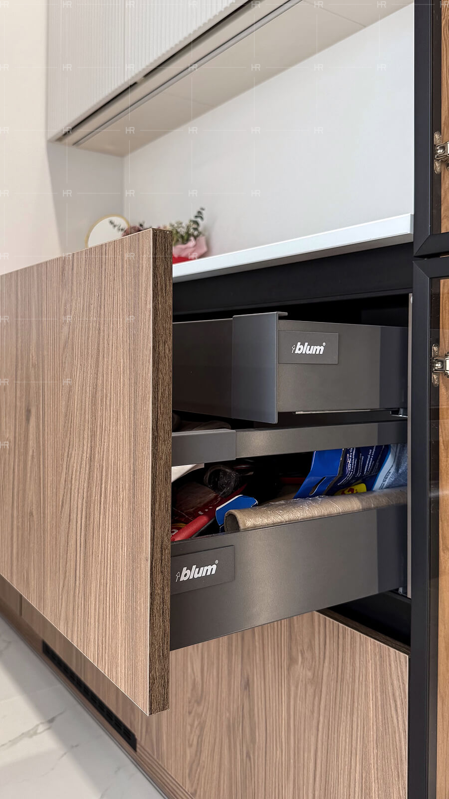 - Выдвижная колонна-карго. Это решение позволяет хранить огромное количество полезных на кухне вещей, не занимая много места, а также выглядит нестандартно.