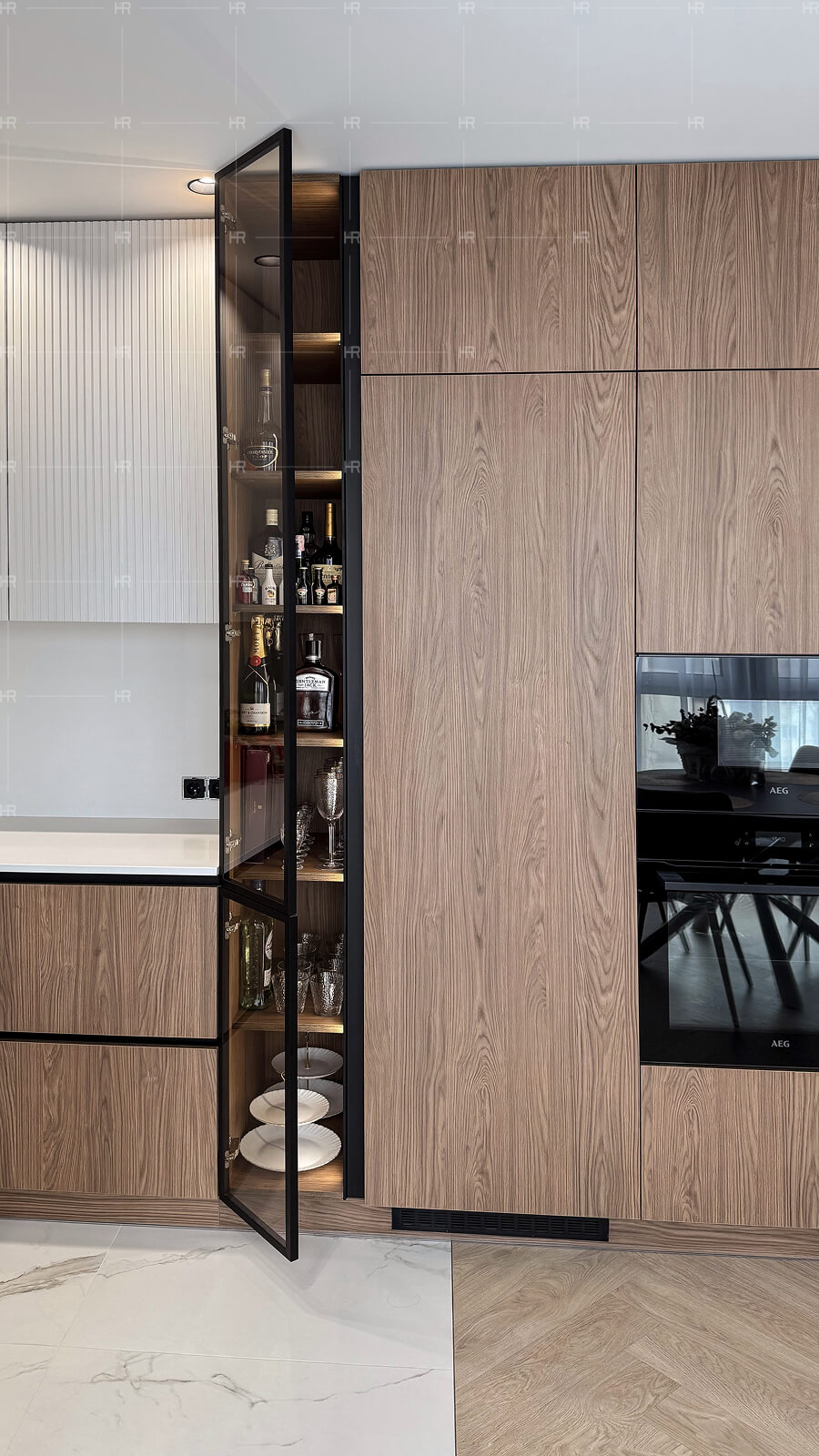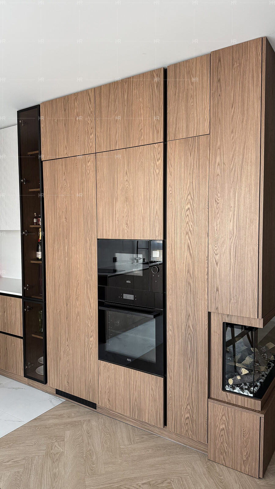 - Двухсоставная кухня. Визуально кухня делится на две части. В первой мы использовали для фасадов специальный тип ЛДСП EGGER — ST 37 — который напоминает шпон и очень выигрышно смотрится за счёт этого. Вторая часть — рабочая зона — выполнена в более светлых тонах.