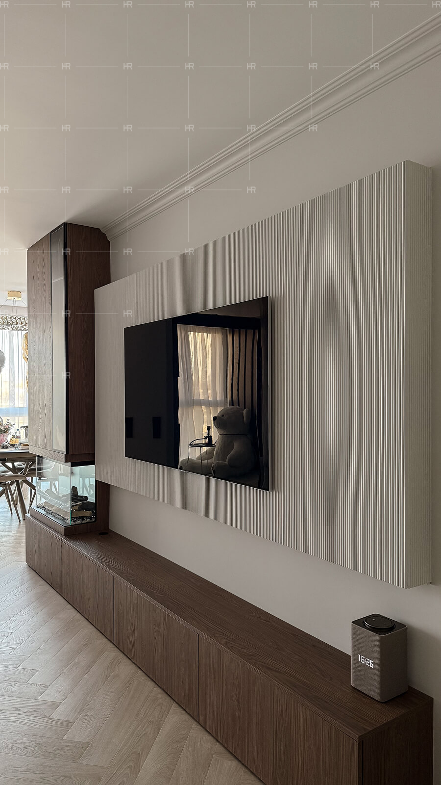 - Декоративный камин. Для гостиной мы использовали встроенный декоративный камин, который притягивает внимание и придаёт интерьеру ощущение домашнего уюта.