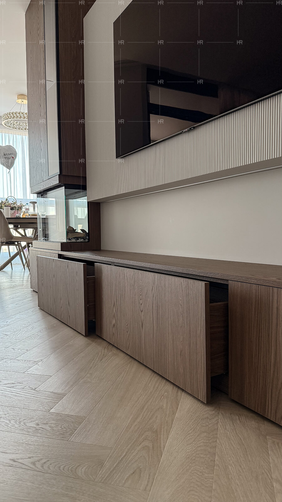 Мы претворили проект в жизнь на основе точных измерений всех габаритов квартиры. Это было необходимо, чтобы обеспечить безукоризненное соответствие мебели планировке и не допустить даже малейших отклонений.