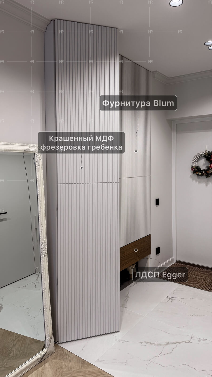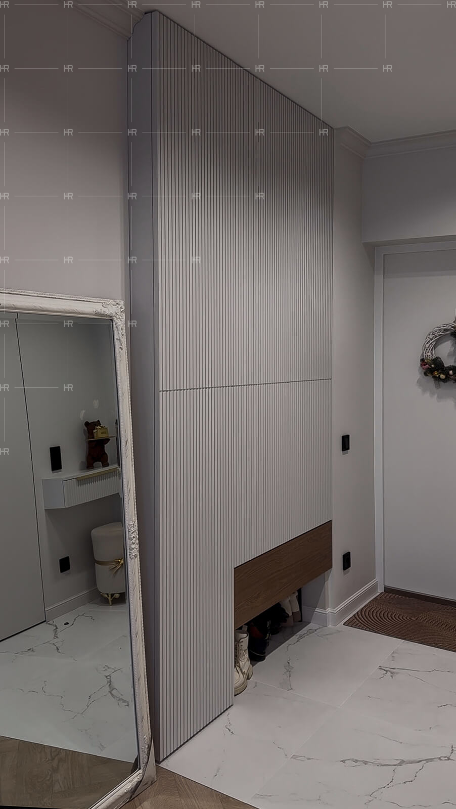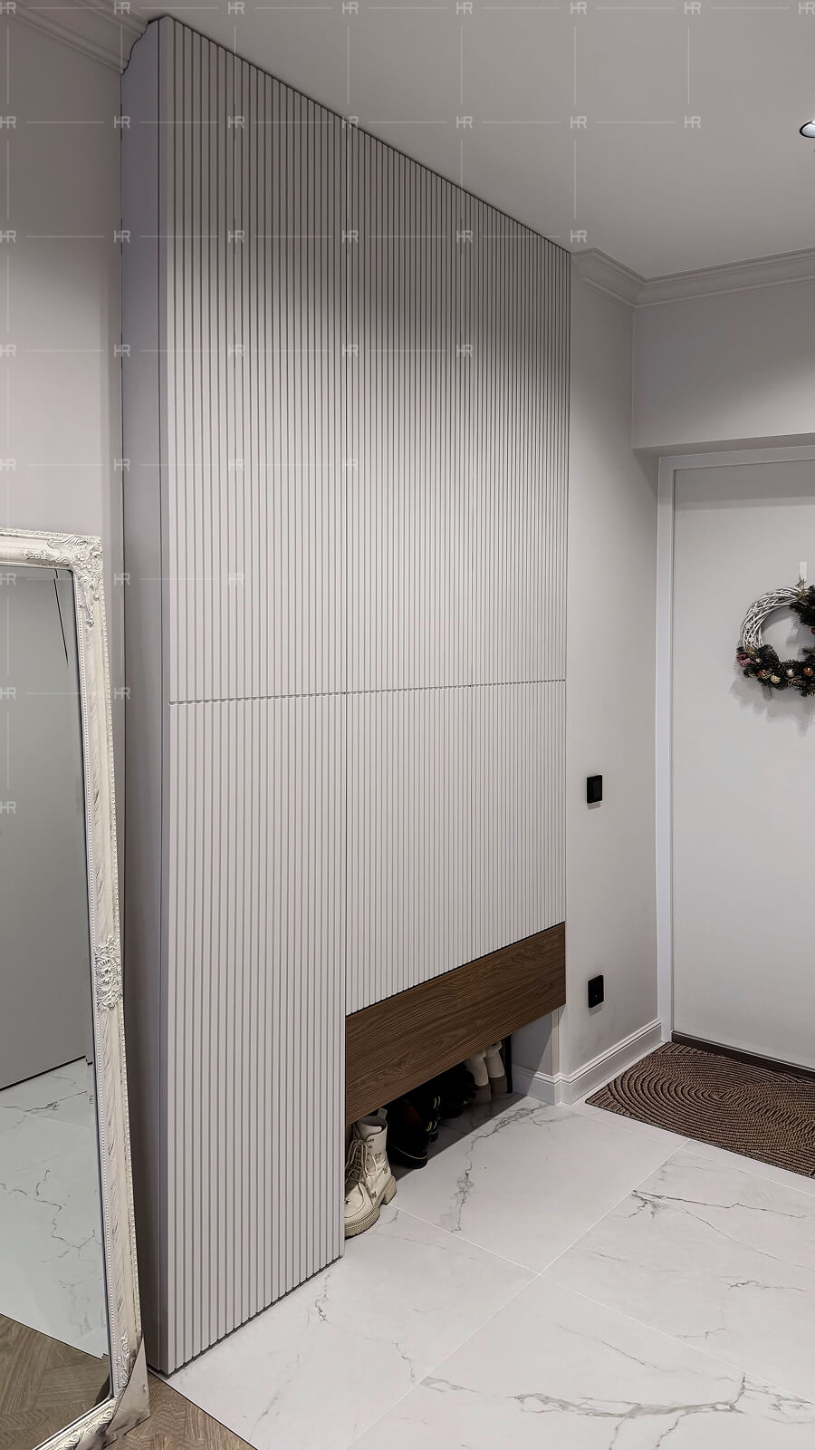 - Аккуратность. Мы придумали интересную и полезную фишку для прихожей — пространство для обуви в нише под встроенным шкафом. Это поможет визуально облегчить интерьер за счёт того, что обувь не будет занимать место на виду.