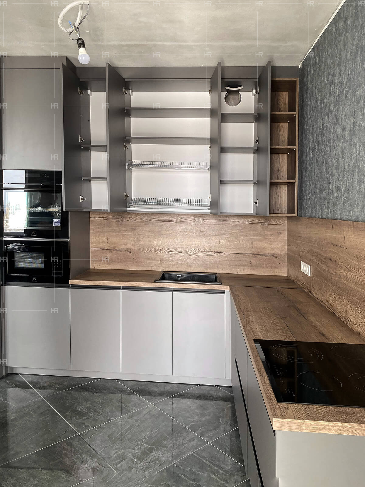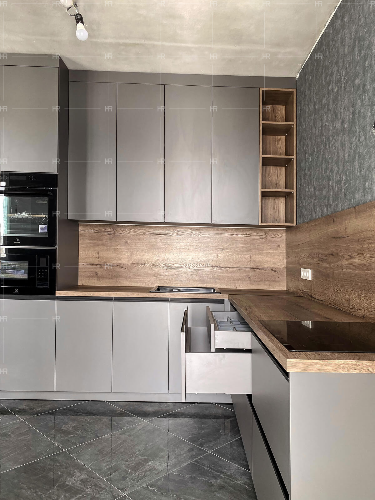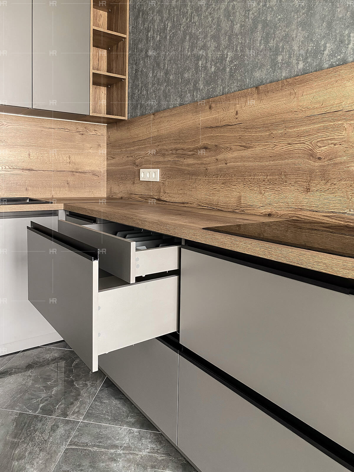 - Скрытые коммуникации. Мы скрыли трубы и другие коммуникации за фальшью, так что даже с открытыми ящиками кухня выглядит максимально эстетично.