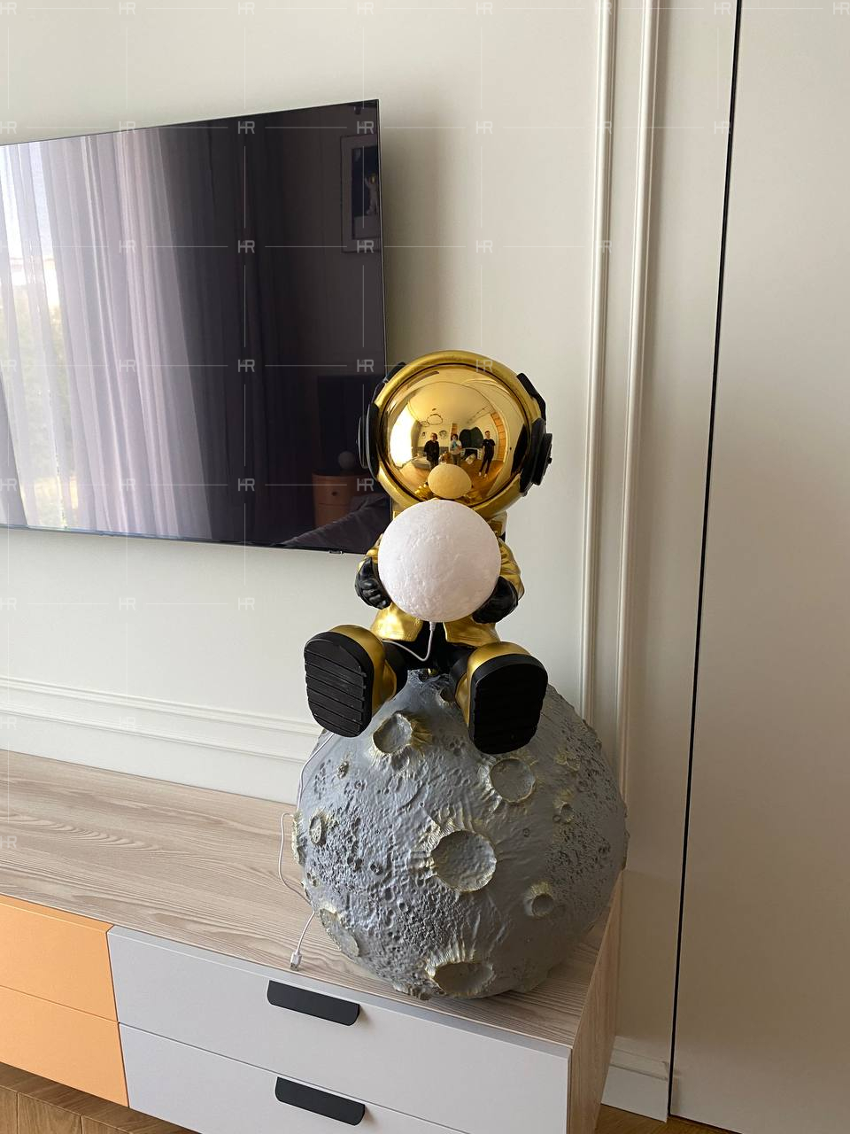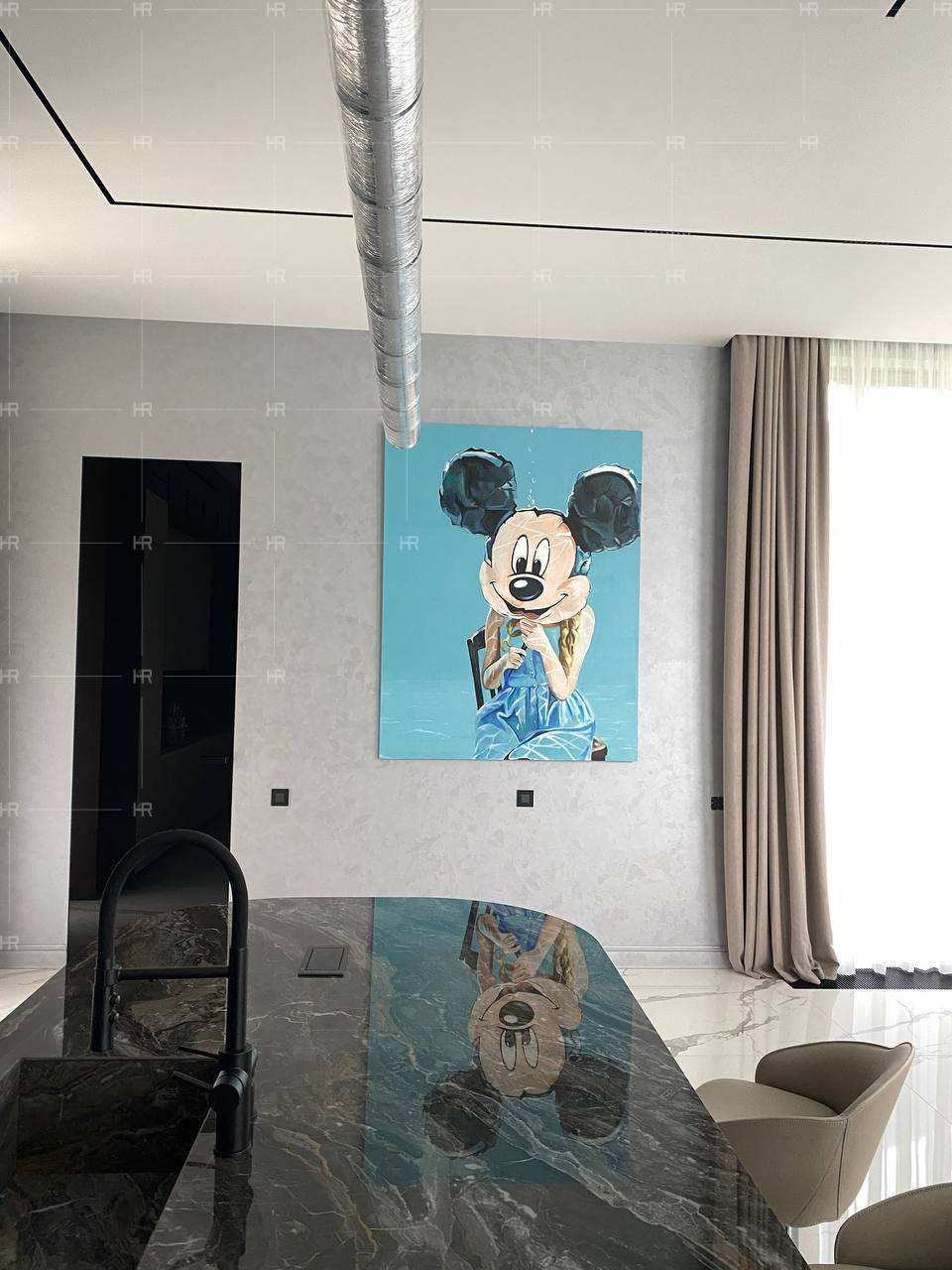 Поскольку дом большой, с высокими потолками, нашему вдохновению было где разгуляться. Обычные решения в нём смотрелись бы неполно. Поэтому мы создали такие элементы, как панно в гостиной, которое занимает всю стену и органично вписывается в пространство и подчёркивает его величину. - Подсветка.