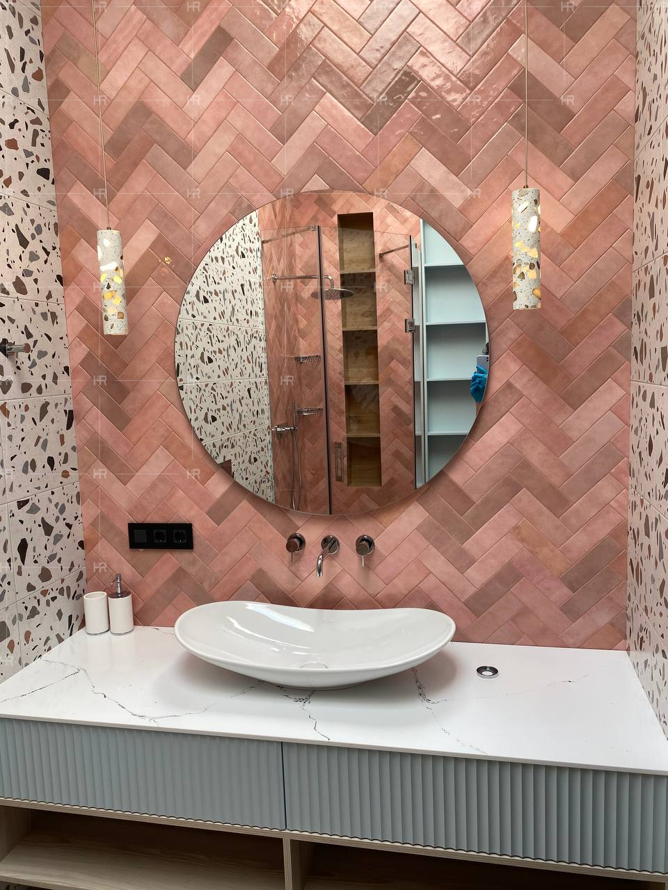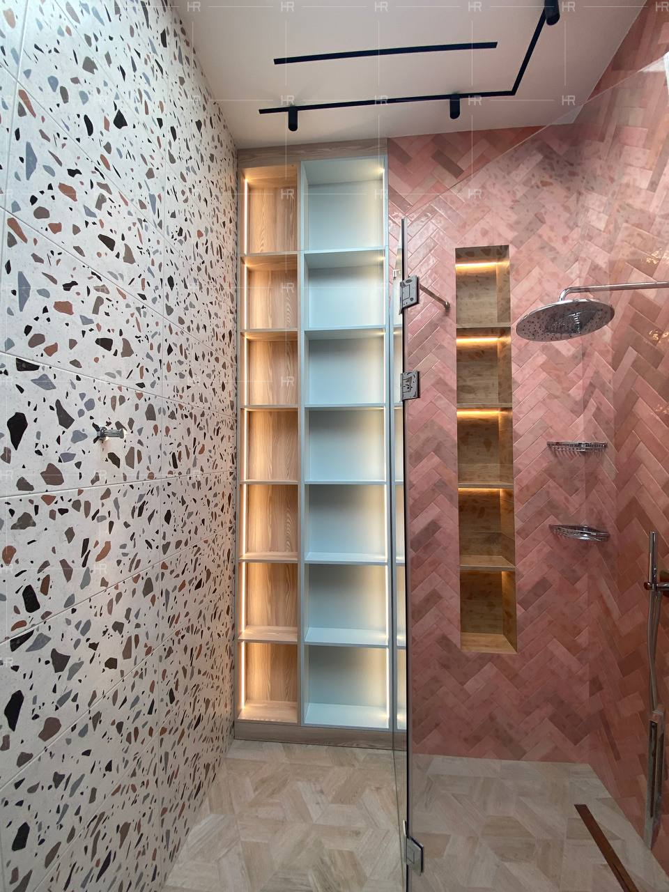 Там, где это было уместно, — например, в санузлах и в детской — мы выделили помещения более яркими тонами. Так, в одной из ванных комнат мы применили коралловую плитку, что не позволяет пространству слиться и “замыливать” глаз. - Фрезеровка.