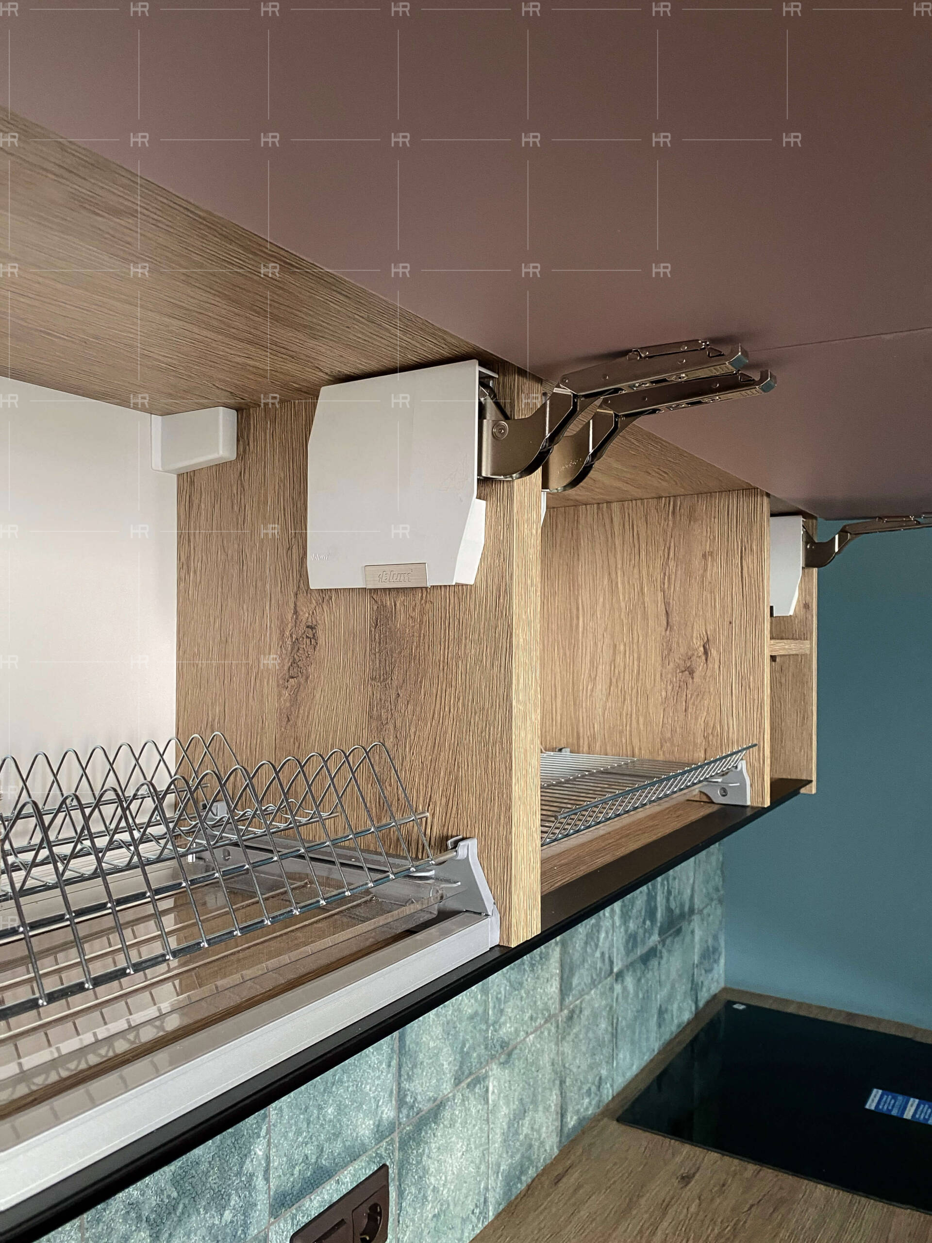 - Делаем так, как удобно клиентам. В данном случае подвесные шкафы повесили ниже, чем обычно, поскольку именно так захотели наши клиенты и именно так было удобно им.