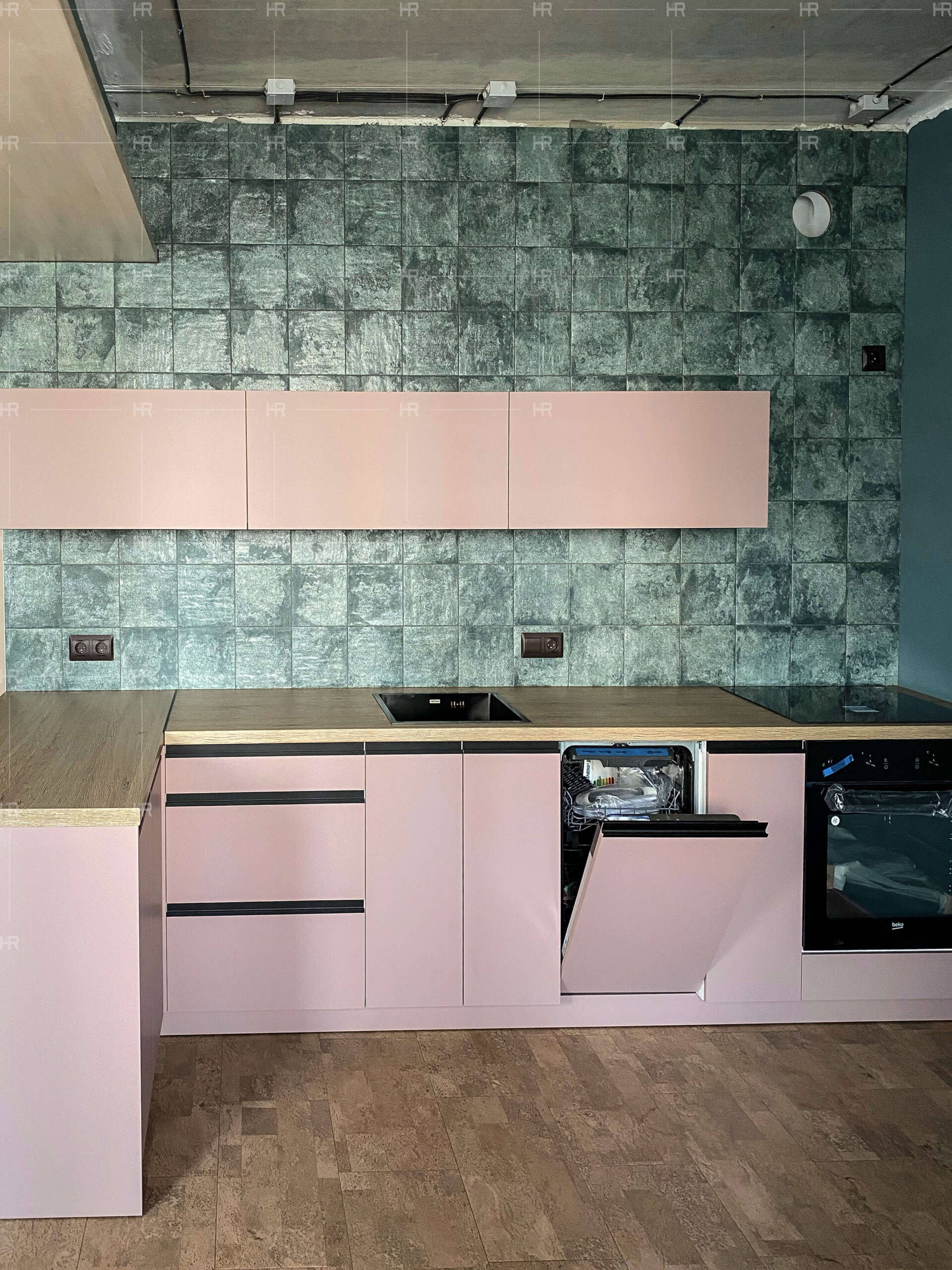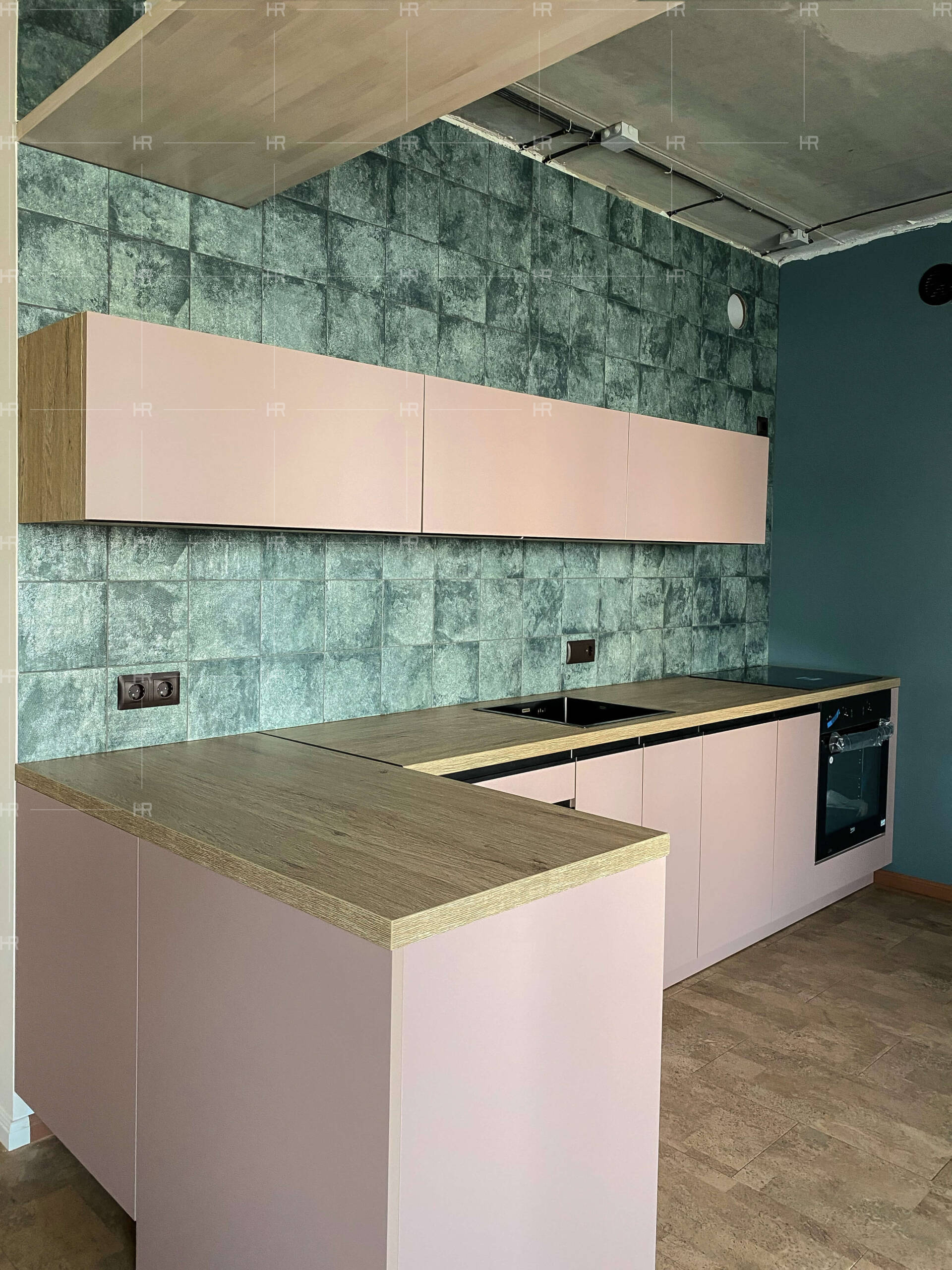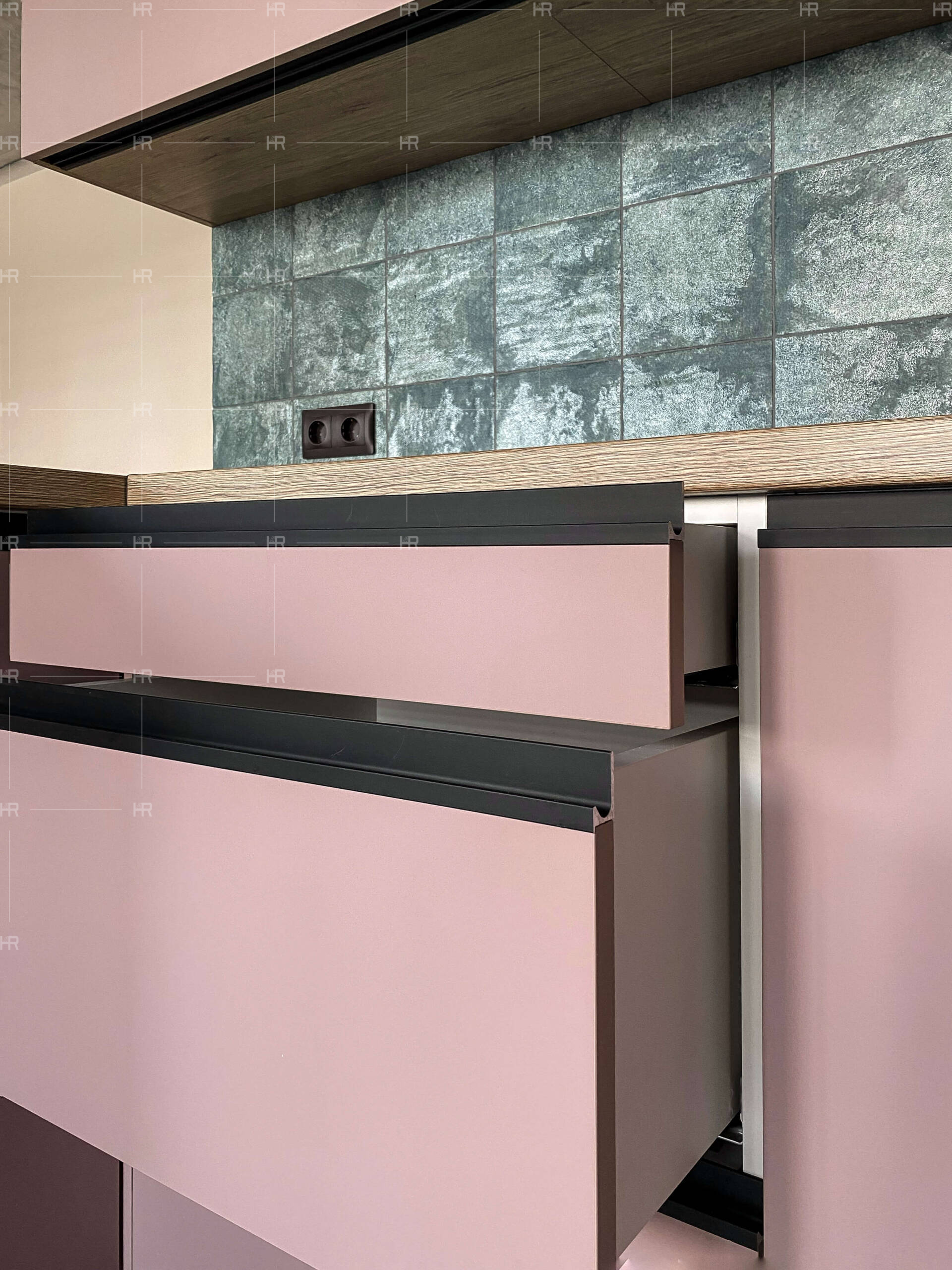 - Светлые тона. Корпус кухни изготовлен из ЛДСП EGGER цвета дуб Антор натуральный, а фасады — из матового МДФ AGT Supramat цвета Pinky, что создаёт визуальную лёгкость и воздушность.