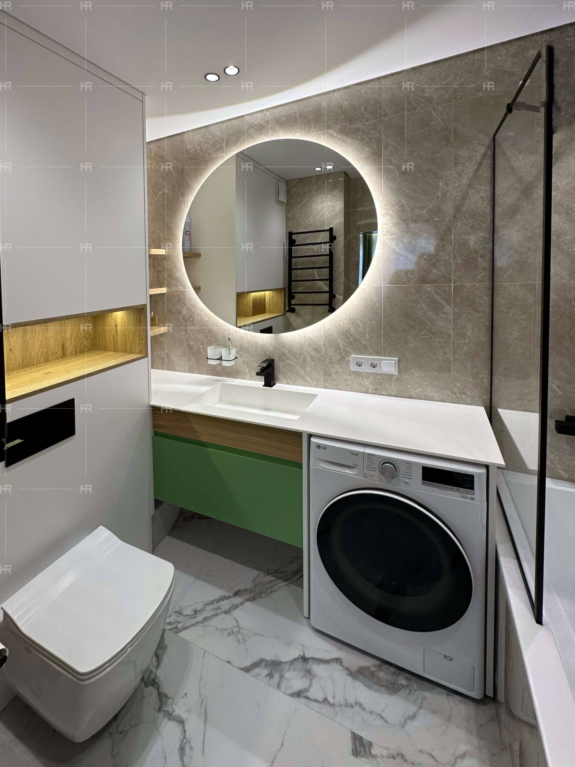 Мы добавили элементы подсветки по всему помещению: по периметру зеркал, в шкафах и на полках, в зоне готовки на кухне. - Ничего лишнего на виду.