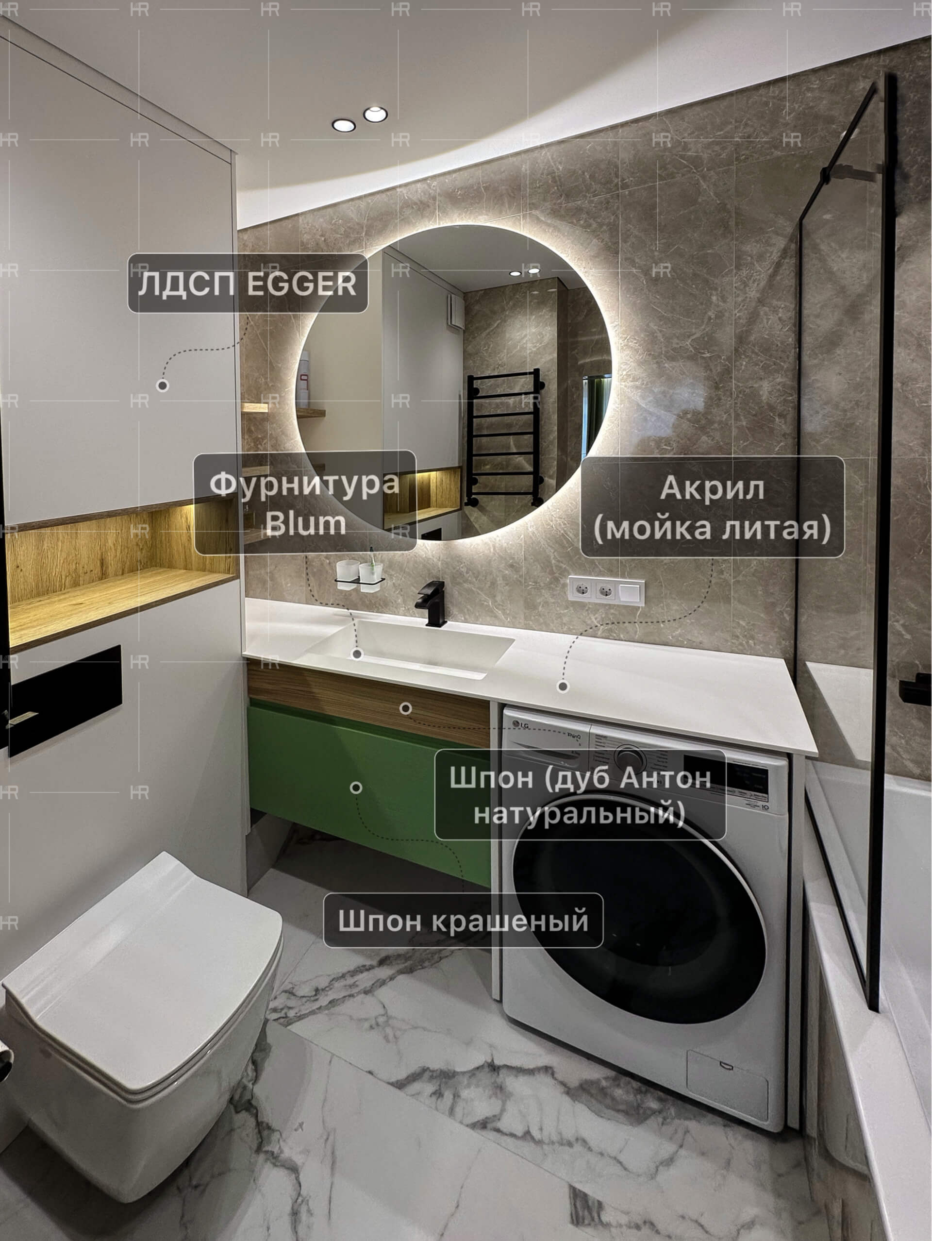 Все подвижные части мебели оборудованы доводчиками, что экономит время на их открытие-закрытие — пусть это всего какие-то секунды, даже этого достаточно, чтобы всё в доме работало на своих владельцев. Все дверцы открываются от нажатия (система tip-on). Зеркало в ванной оснащено подогревом — так оно не будет запотевать во время принятия душа. - Только лучшие материалы.