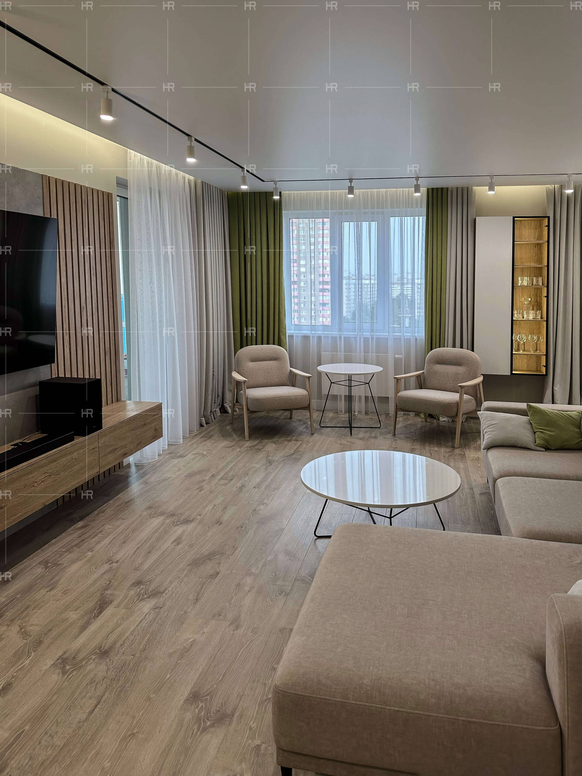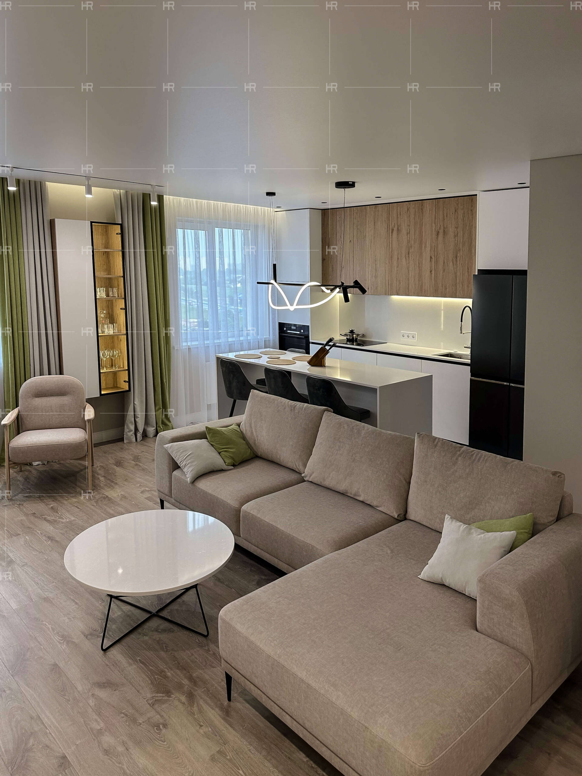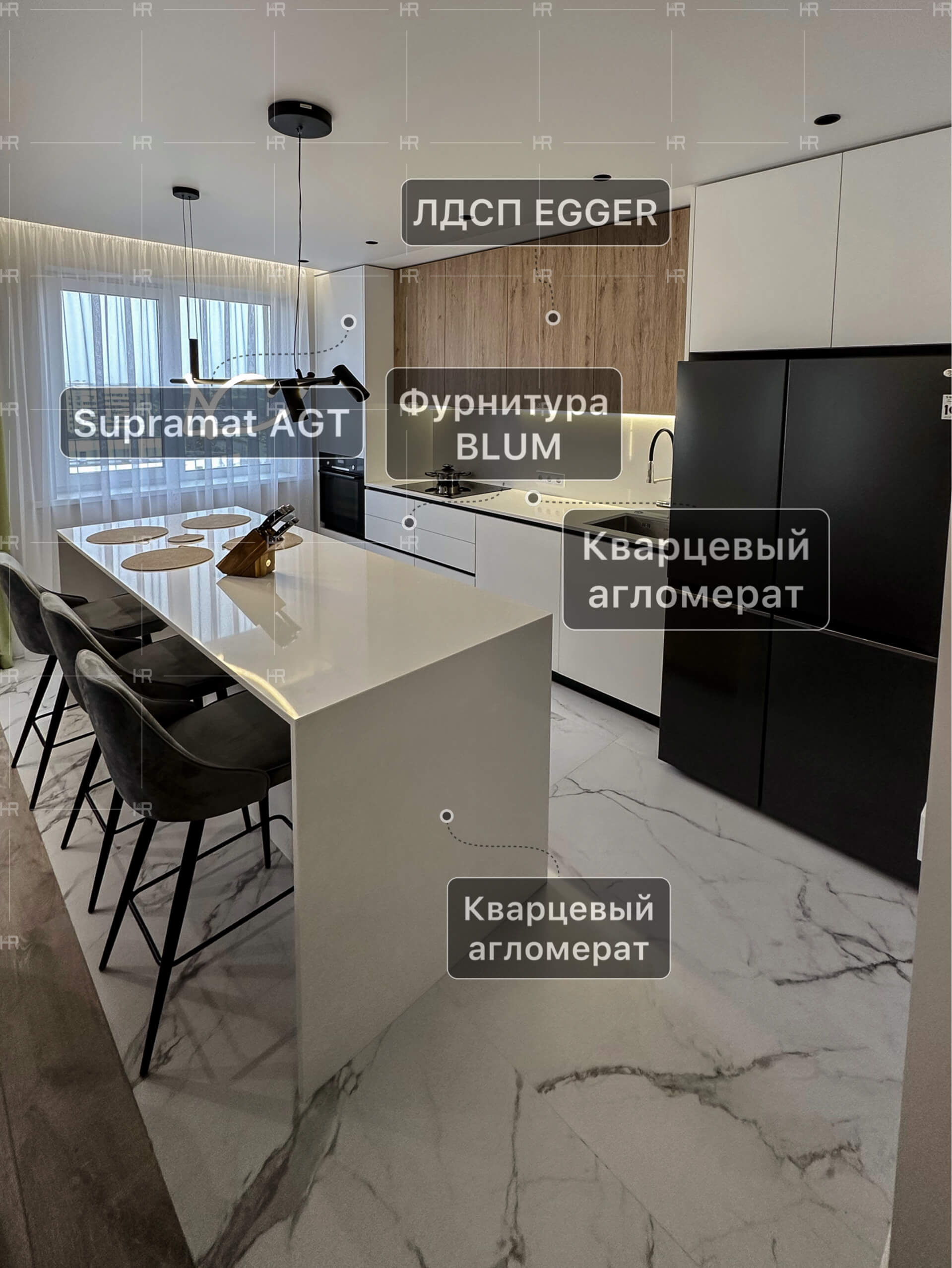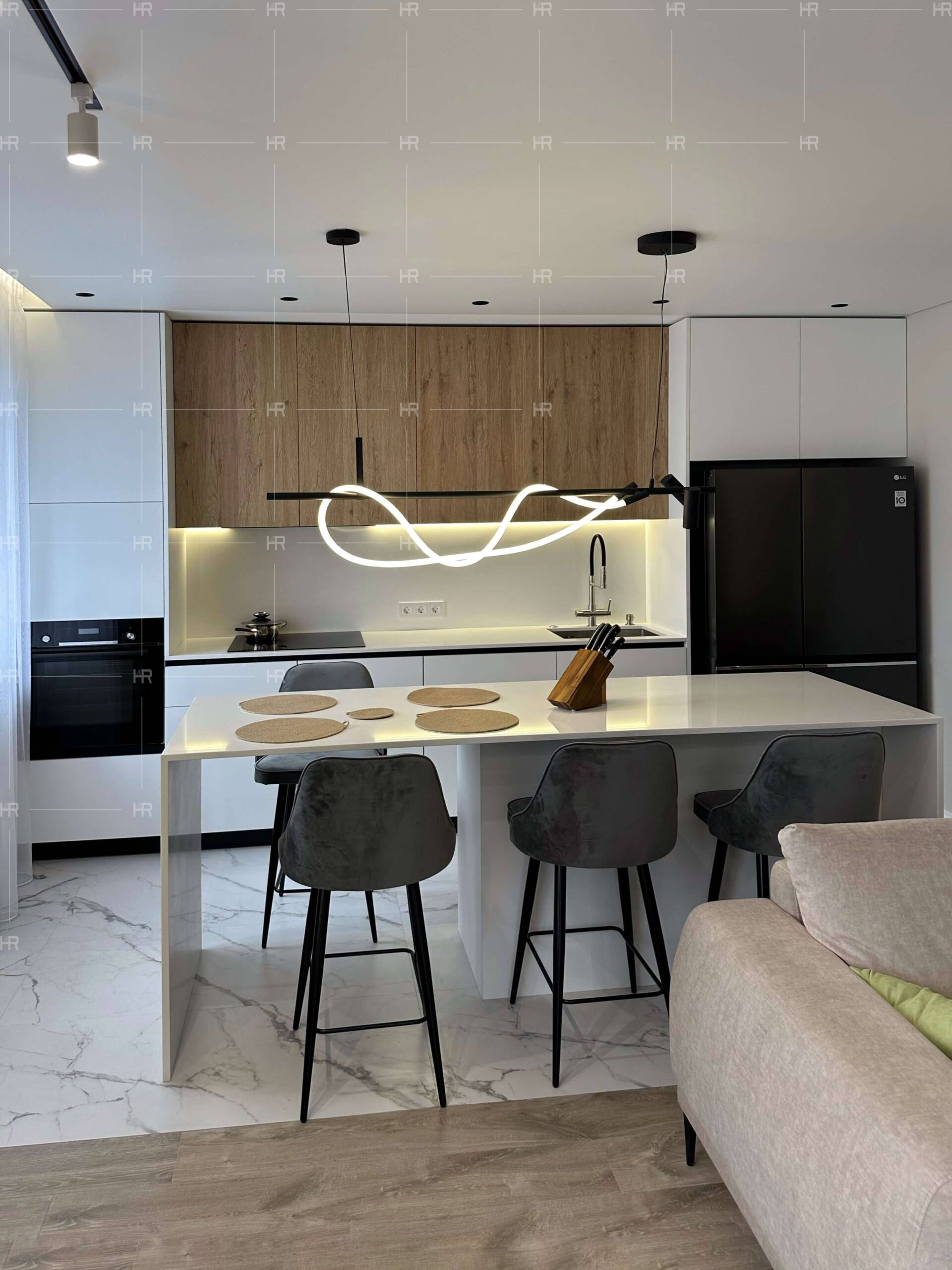 Вся мебель выполнена из качественных материалов, которые лучше всего подходят именно этому проекту: кварцевого агломерата, камня, шпона, ЛДСП. Также HOME REPUBLIC использовали краску финского бренда Tikkurila, который имеет более чем полуторавековую историю. - Светлая квартира для светлых людей.