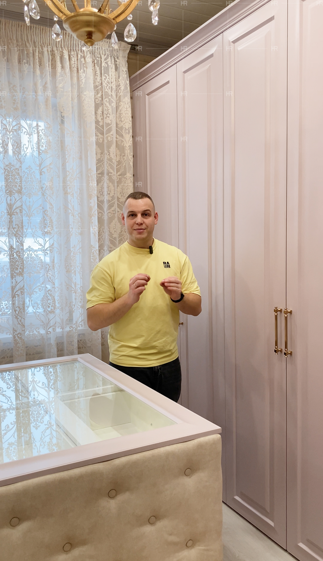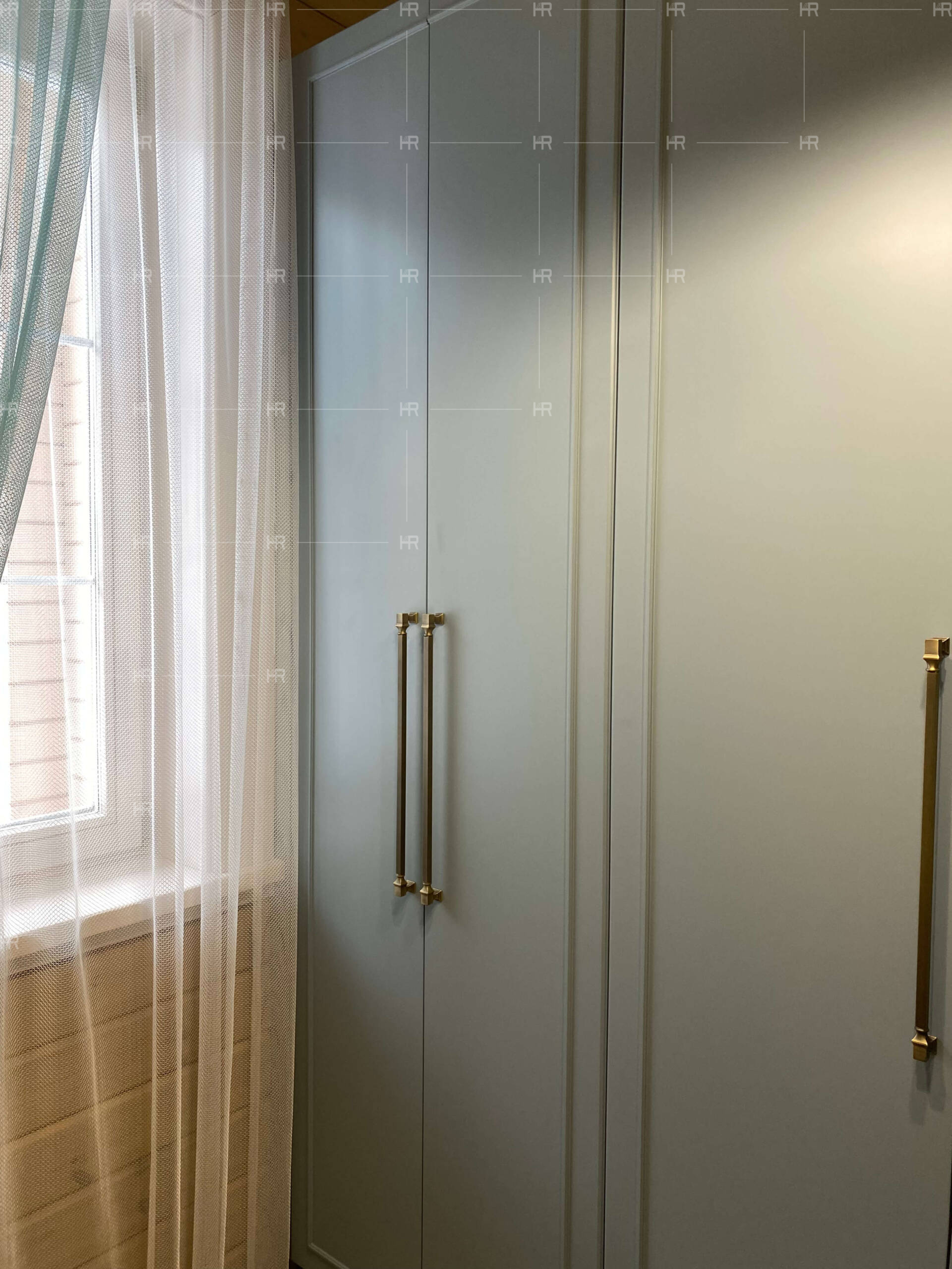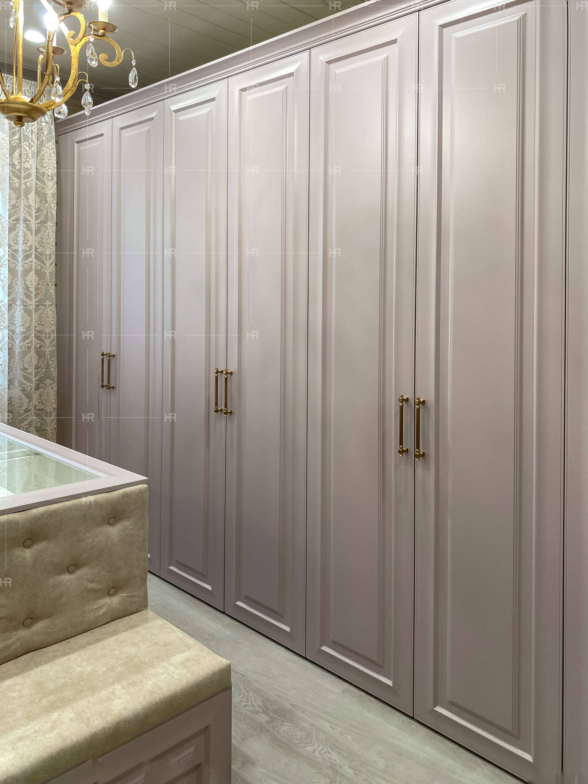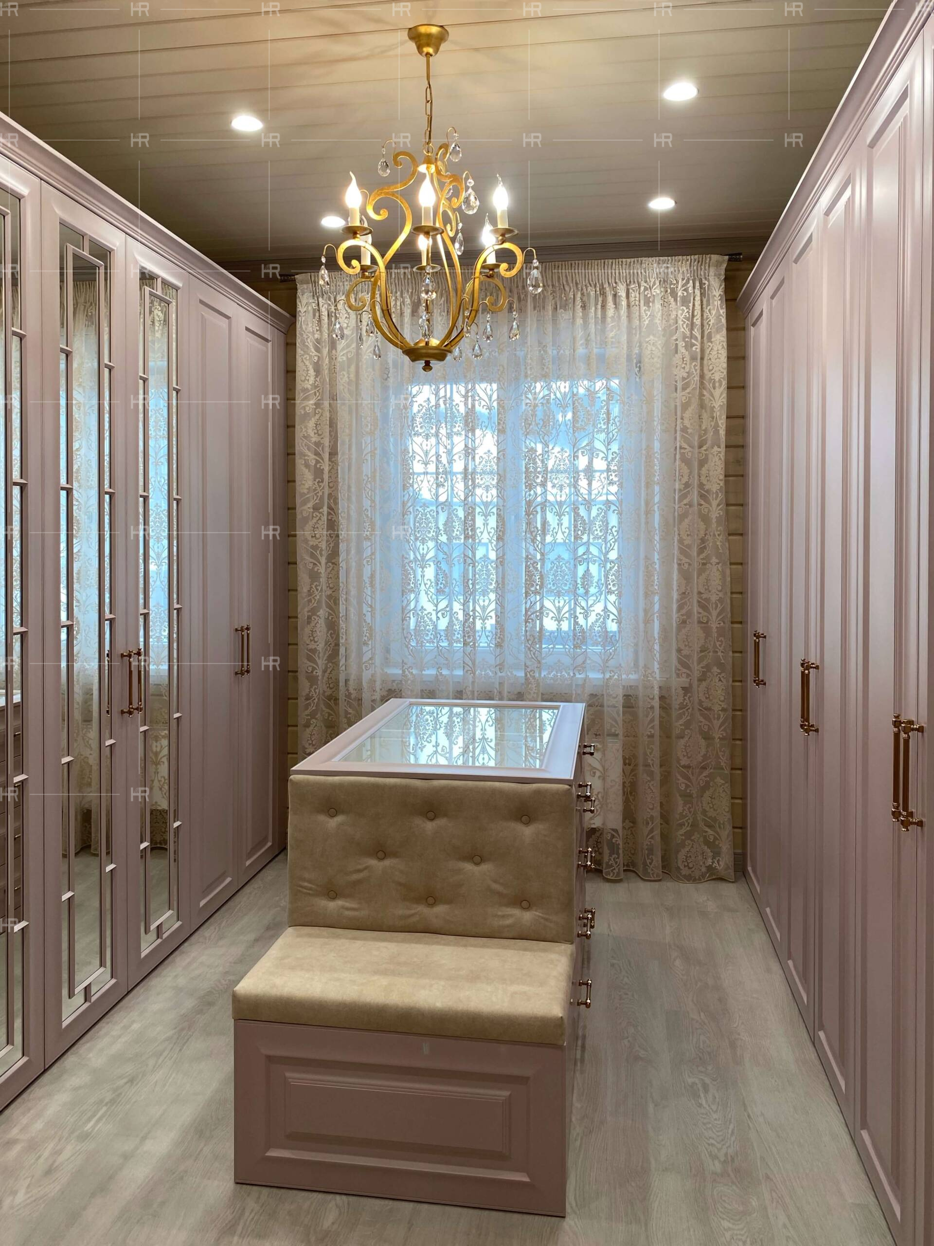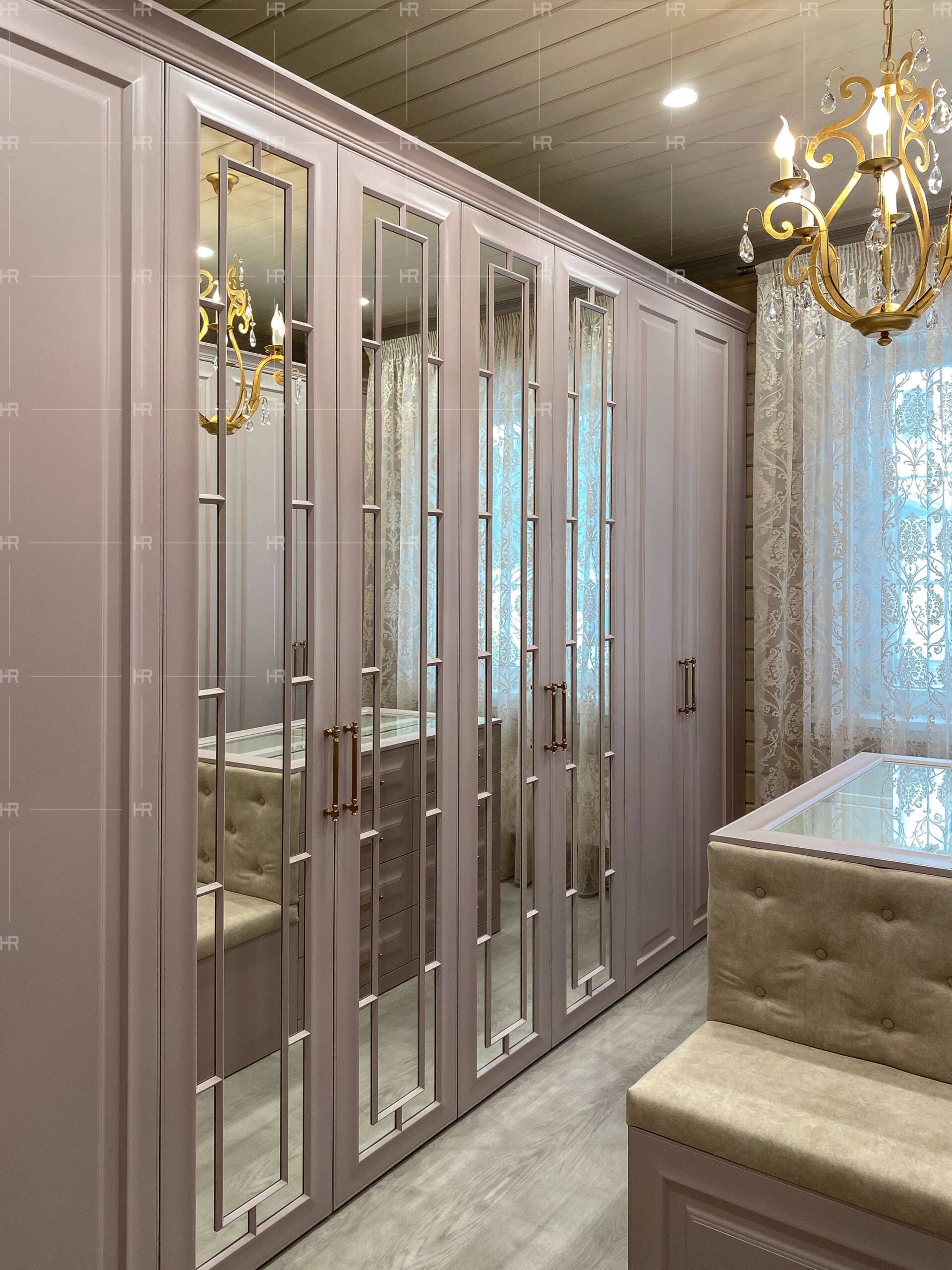 Чтобы внести приятного разнообразия в обстановку гардеробной, с одной стороны мы поставили глухие шкафы, а с другой — украшенные зеркалами и более сложной фрезеровкой.