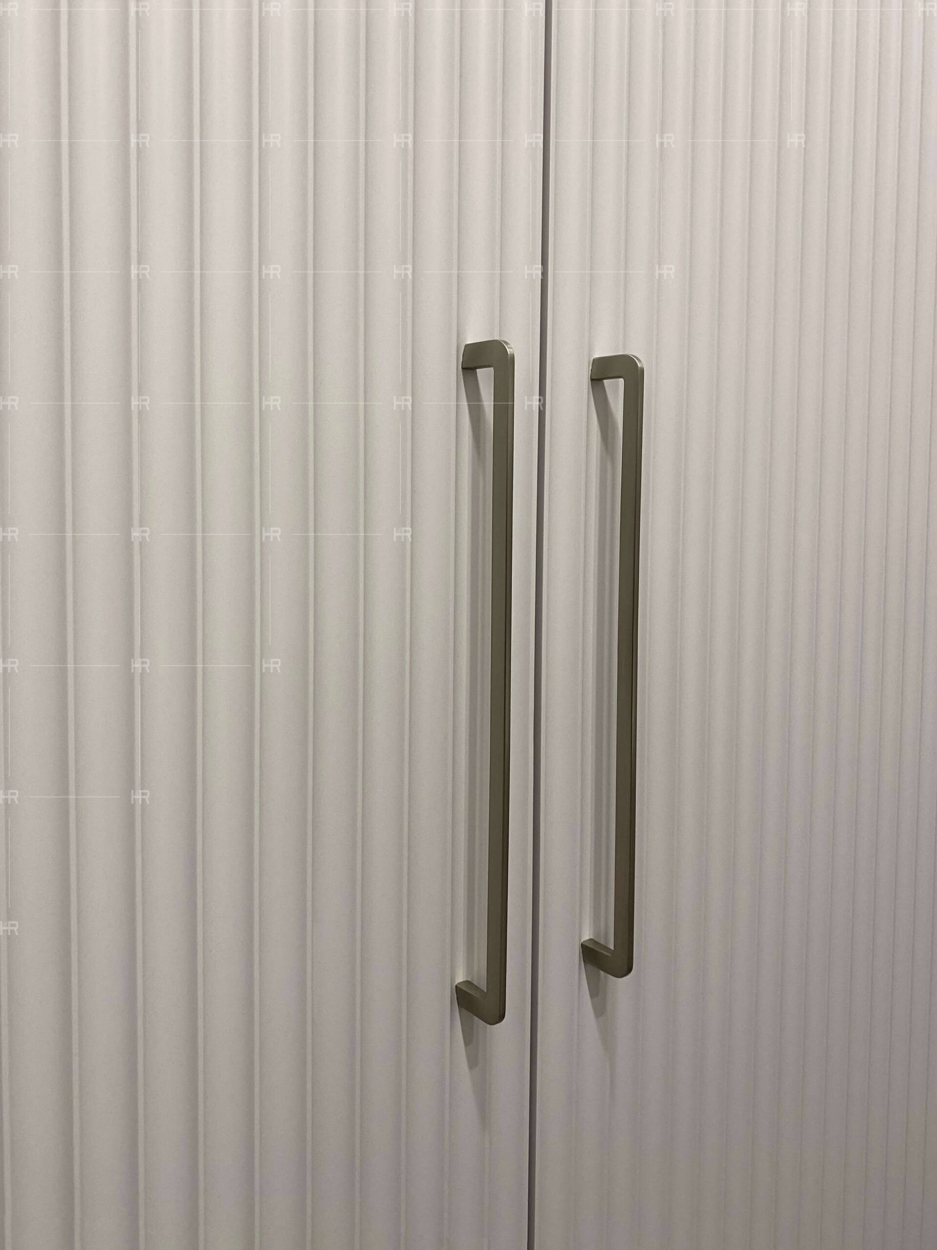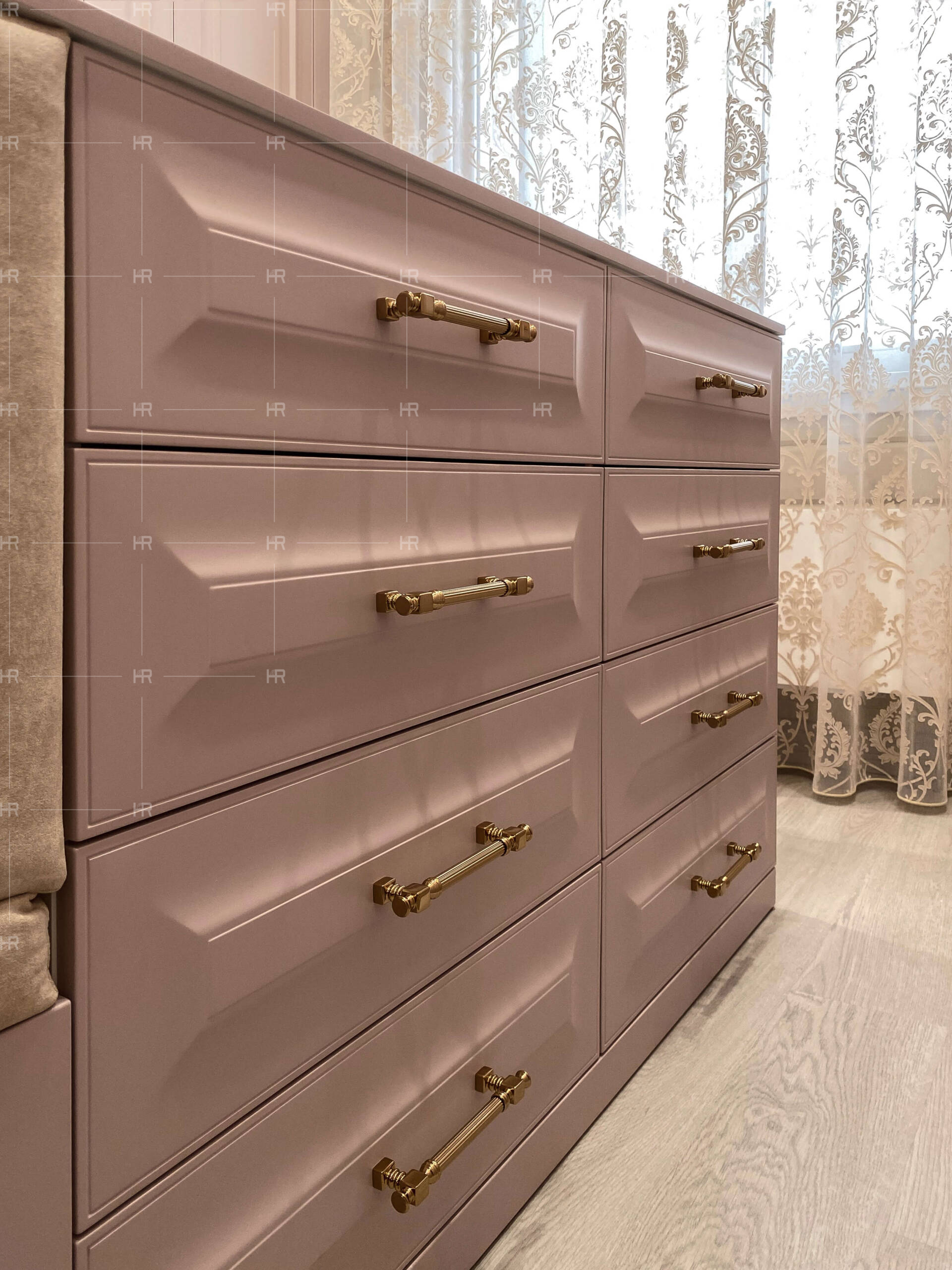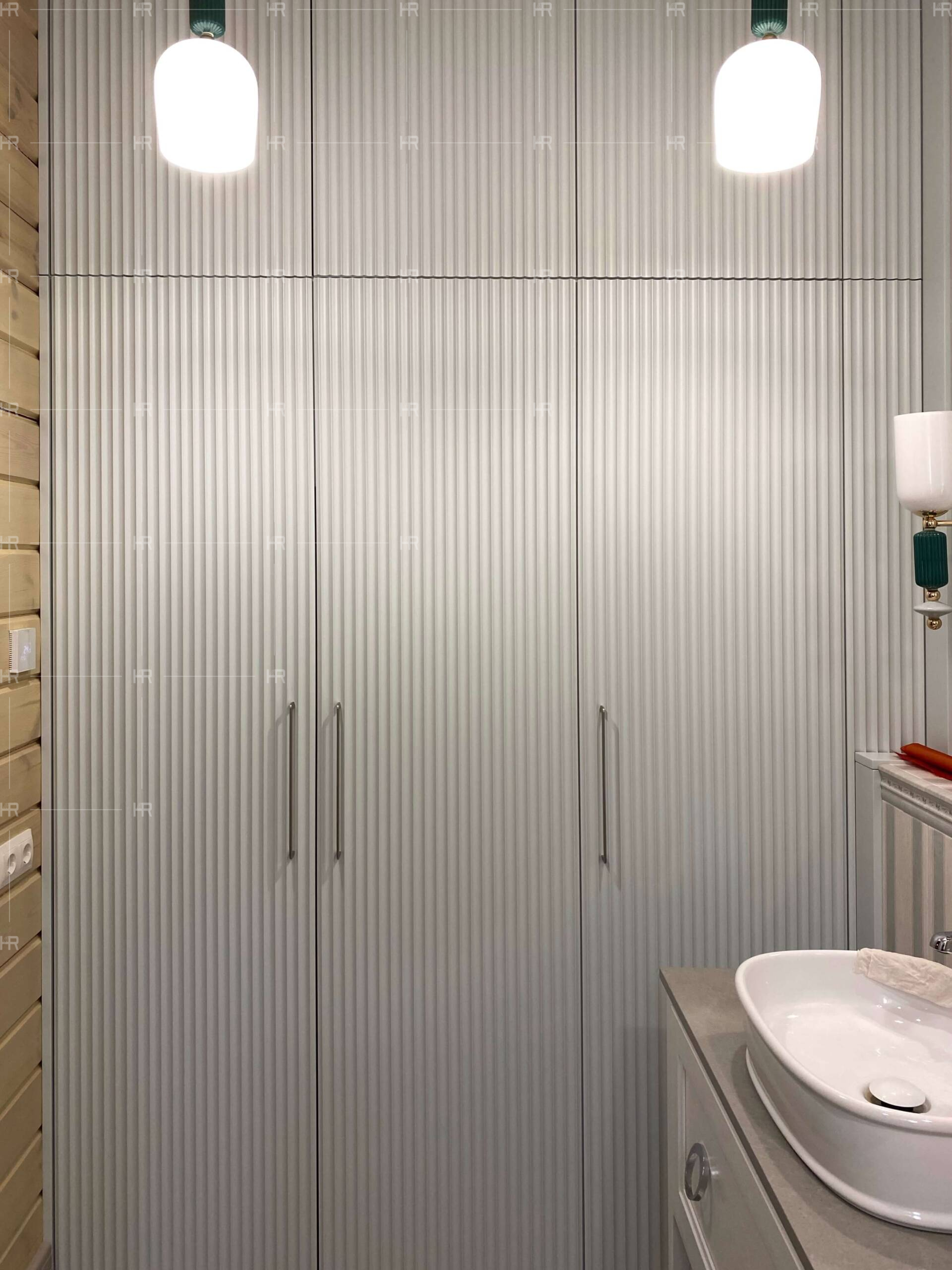Мы решили воздержаться от открытого типа хранения — то есть, все полки в гардеробных закрыты фасадами из крашеного фрезерованного МДФ. При этом створки фасадов имеют общую фрезеровку, что создаёт дополнительный эстетический эффект. - Нестандартные текстуры.