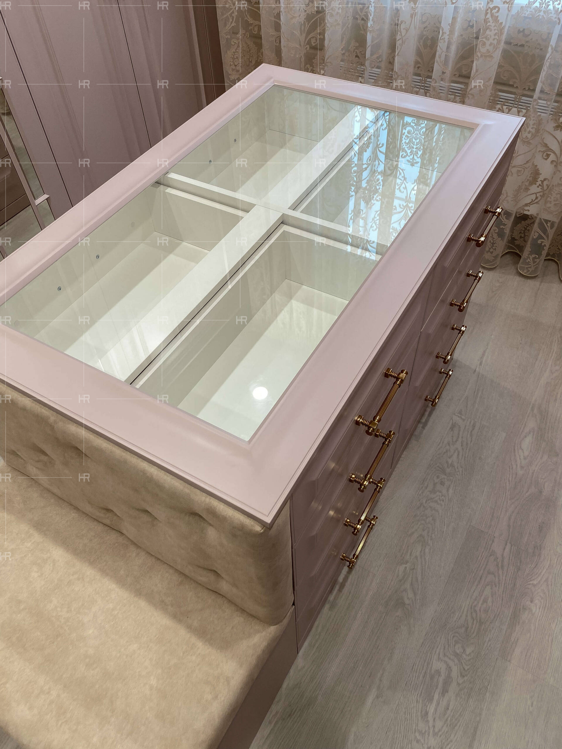 Площадь гардеробной позволила установить между двумя рядами шкафов “остров”, что очень выигрышно смотрится и даёт дополнительные возможности для хранения обуви и аксессуаров. - “Утопленные” цоколи для безопасности и удобства ног.