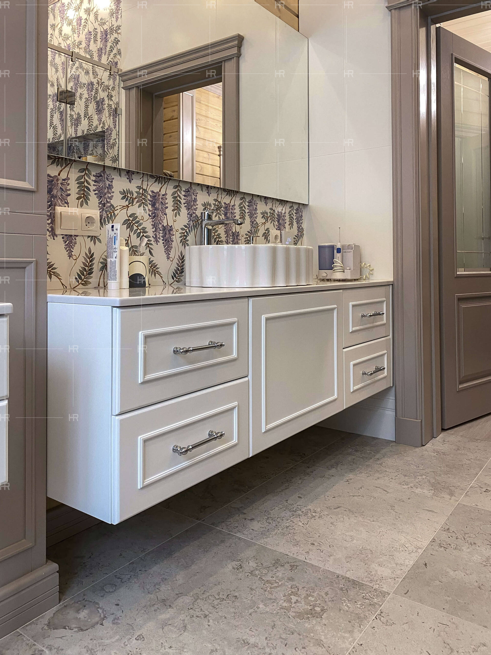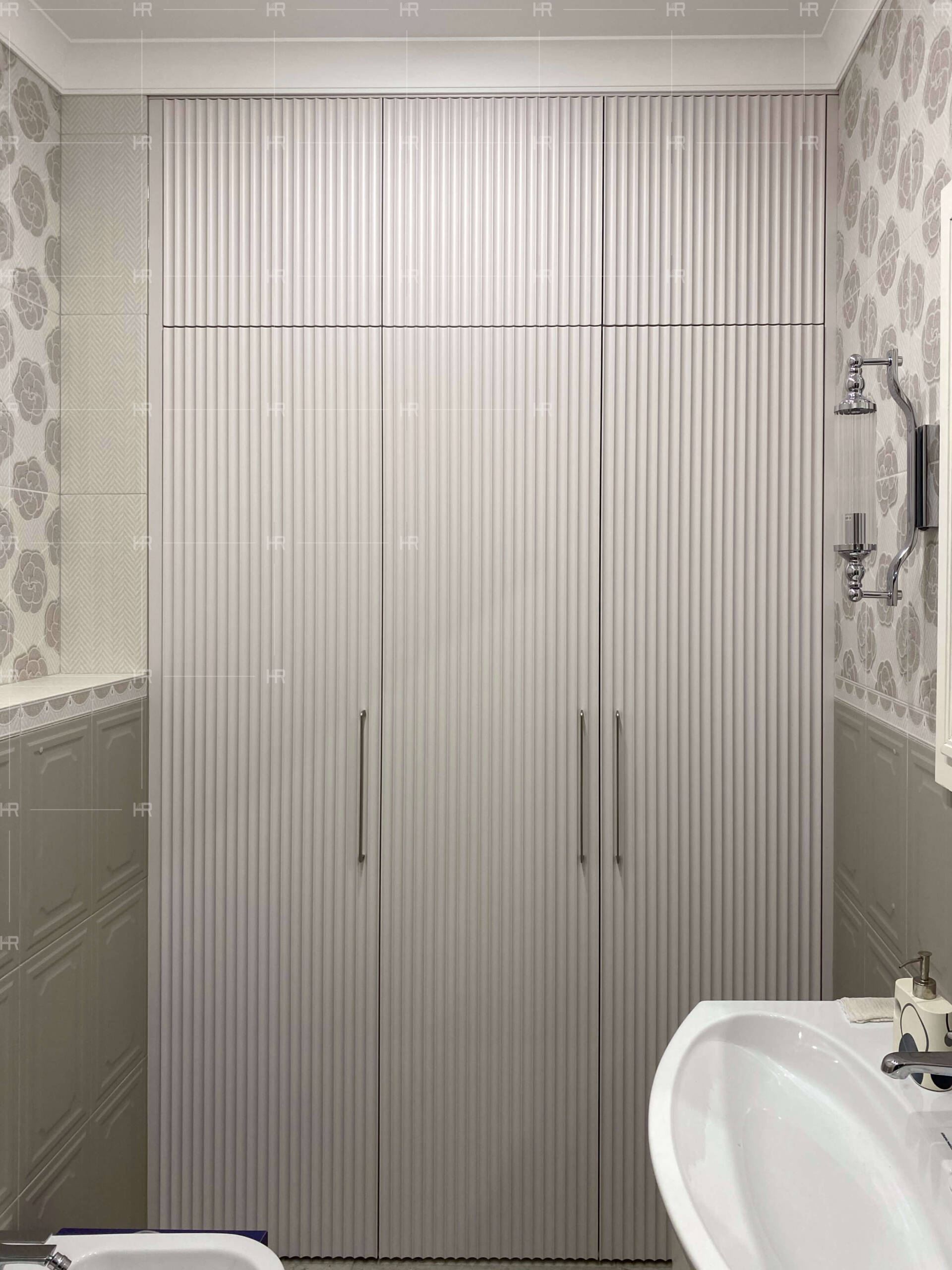 Для фасадов в ванной комнате также использовали крашеный МДФ, но с другой фрезеровкой — гребёнкой. Это создаёт очень интересный визуальный образ благодаря такой необычной текстуре. - Никакой случайной фурнитуры.