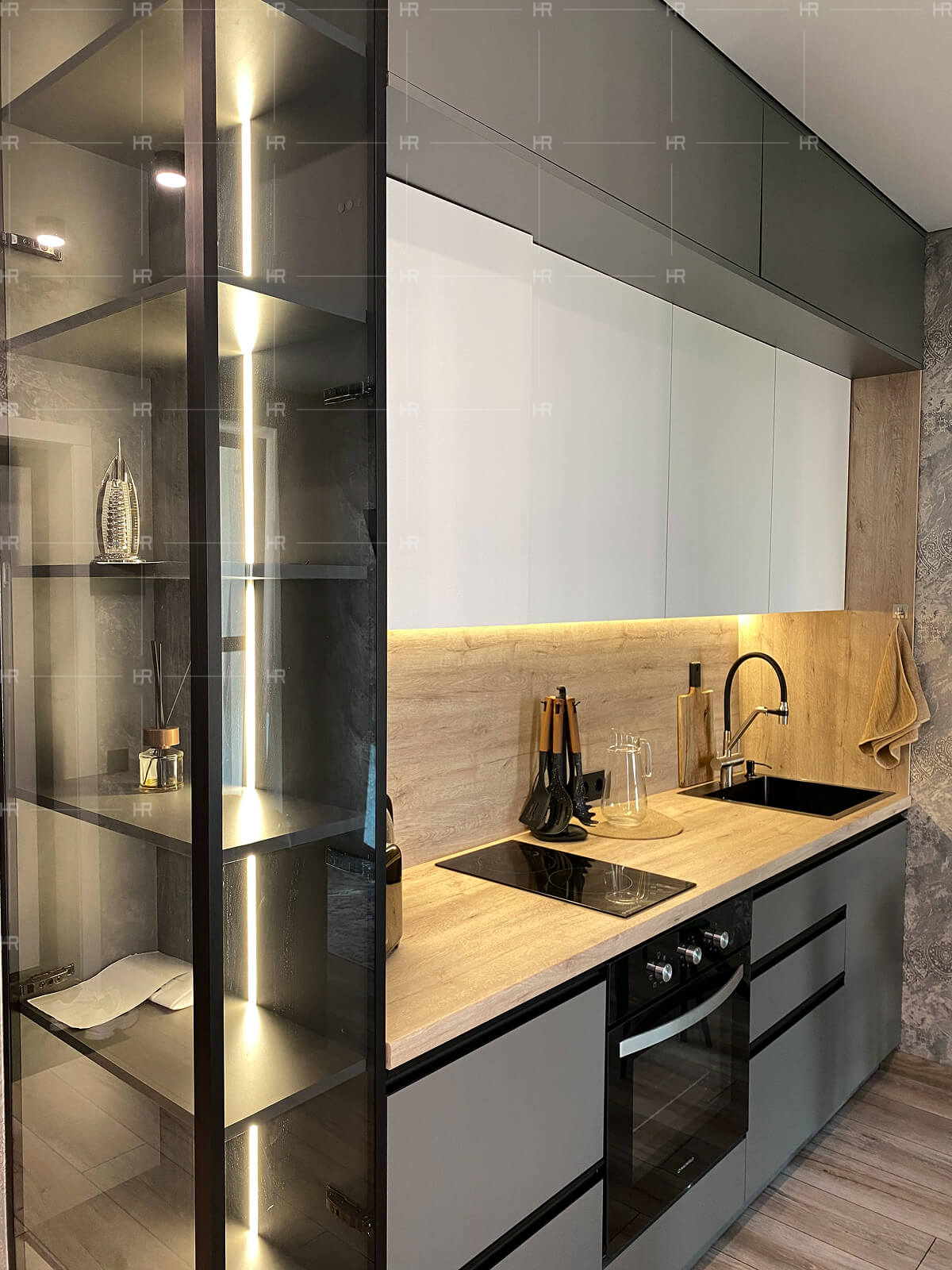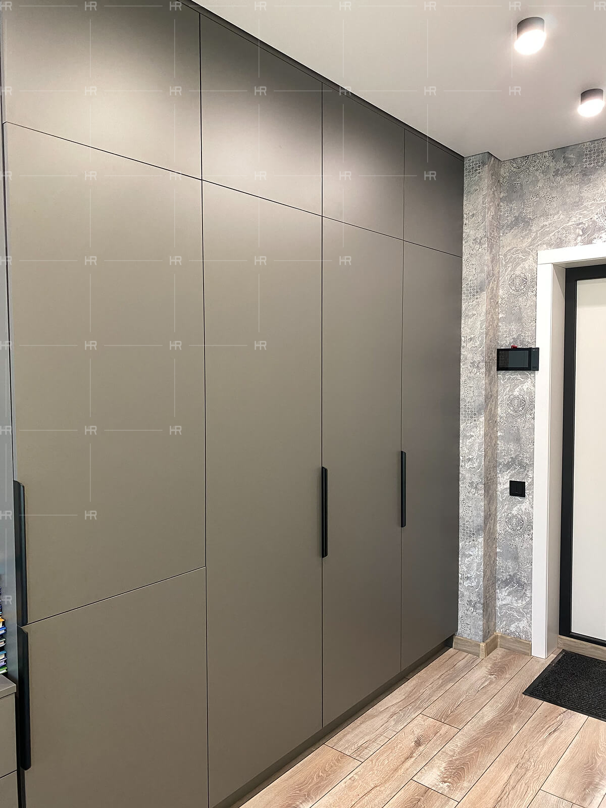 Мы внимательно изучили планировку квартиры и учли расположение инженерных узлов. На основе этой информации мы спроектировали мебель для кухни, прихожей и жилой зоны. Все предметы изготовлены по индивидуальным проектам, чтобы в точности подойти под габариты квартиры.