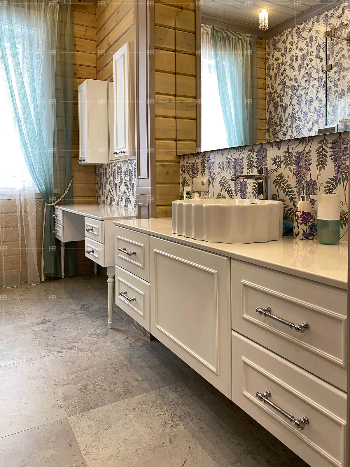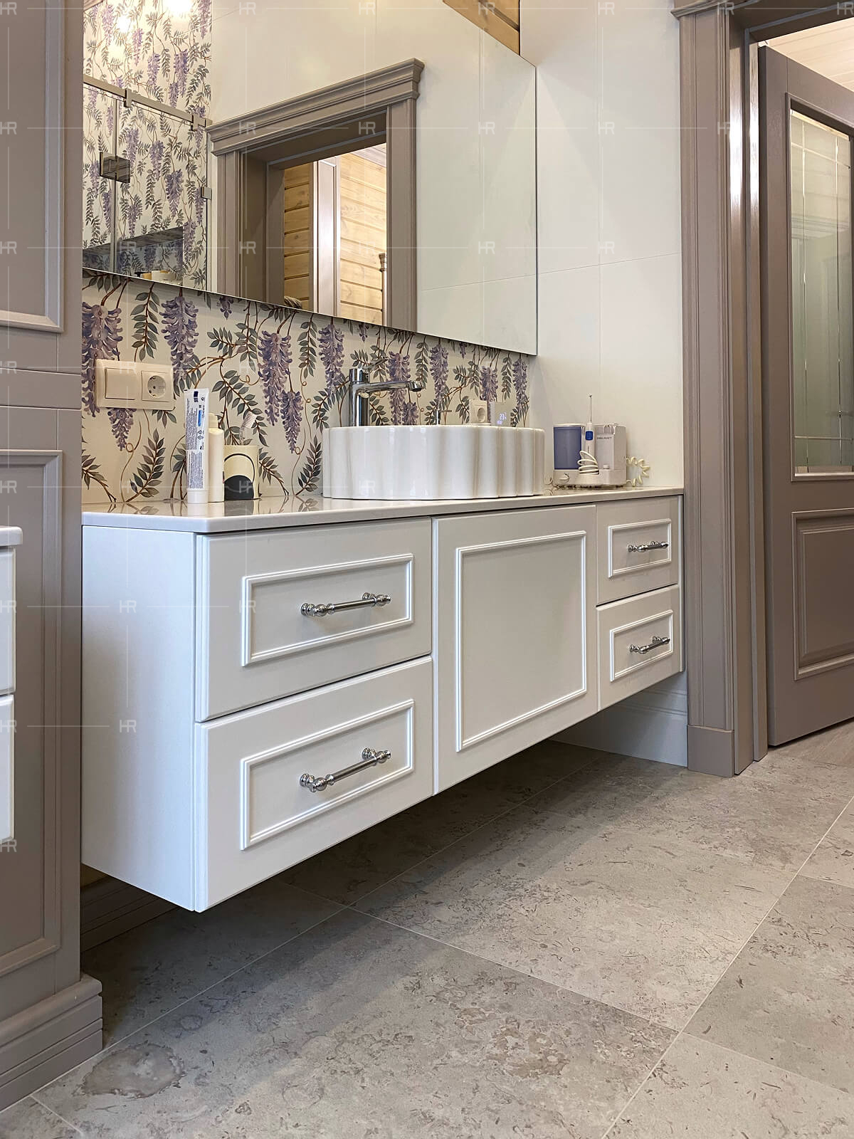 - Фрезеровка. Минималистичный и скромный дизайн имеет своё место, но это был не тот случай. Чтобы передать премиальность интерьера с первого взгляда, мы отдали предпочтение сложной фрезеровке фасадов и дверец.