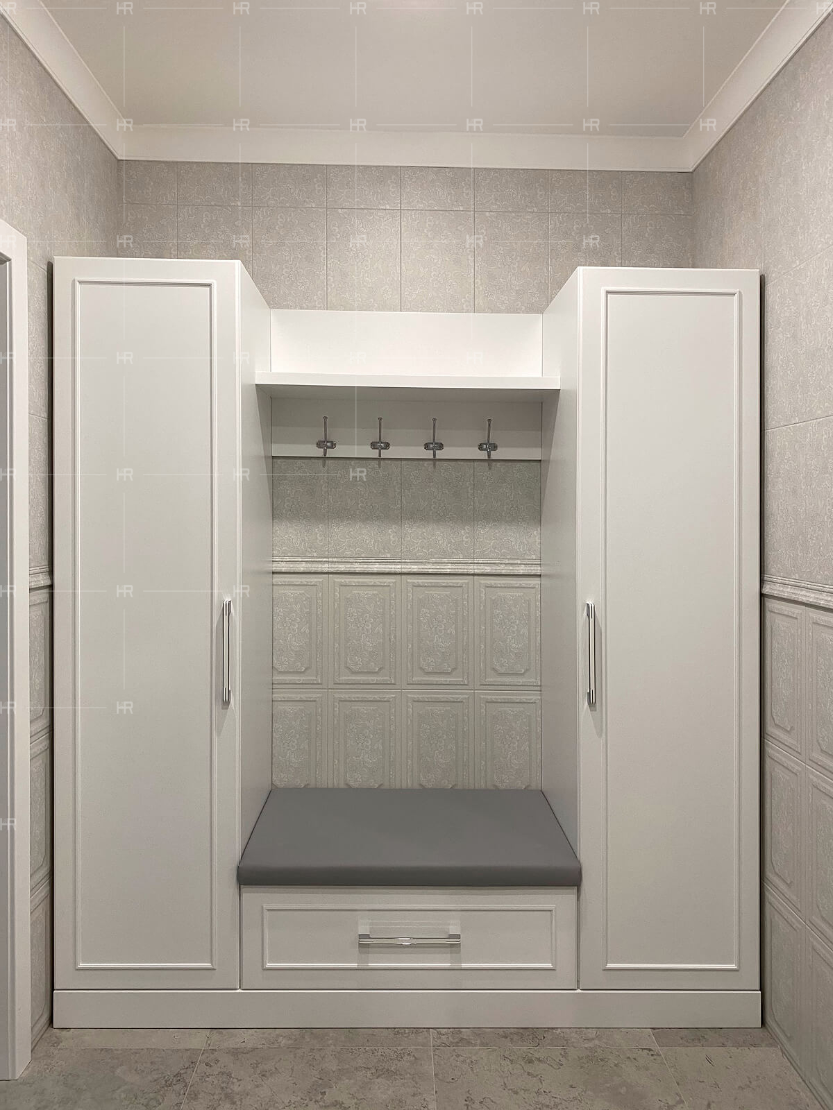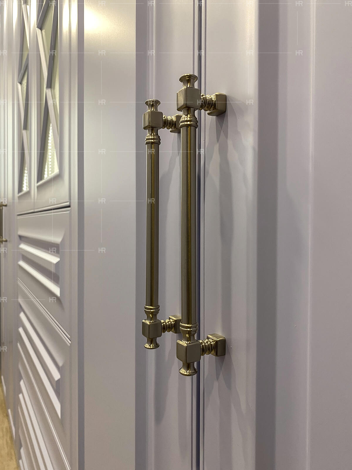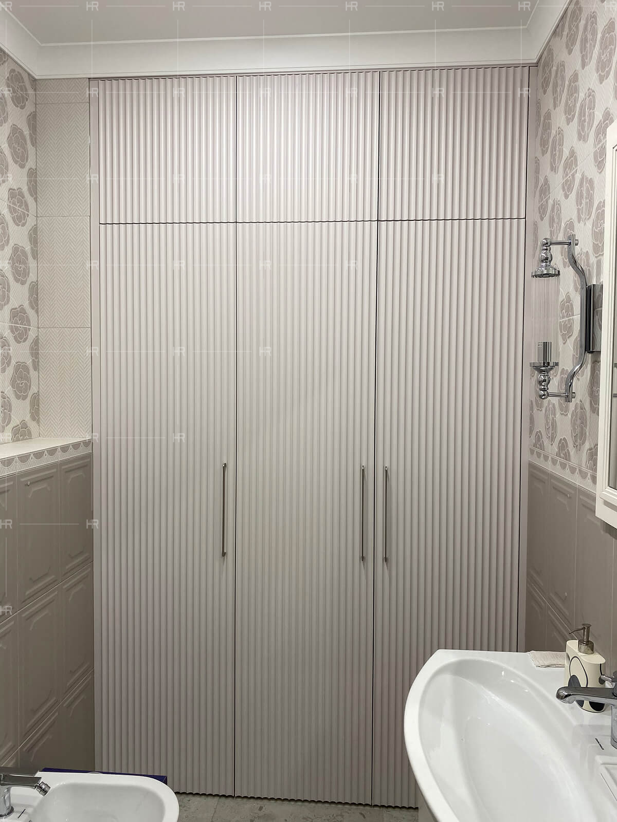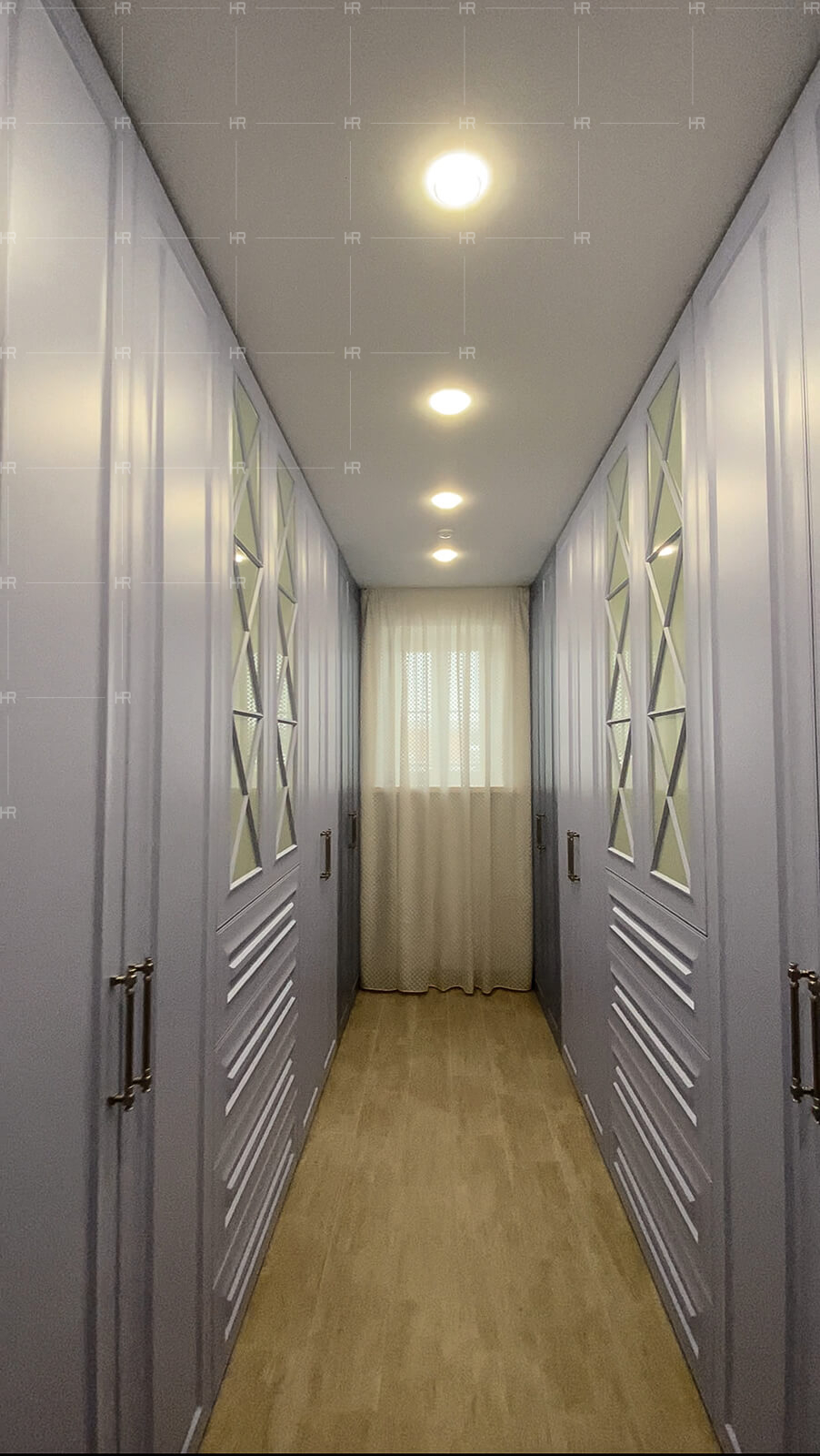 - Двери с врезным выпрямителем. Поскольку в доме высокие потолки, двери шкафов также получились высокими, а в этом случае мы всегда рекомендуем выбирать варианты с выпрямителем.