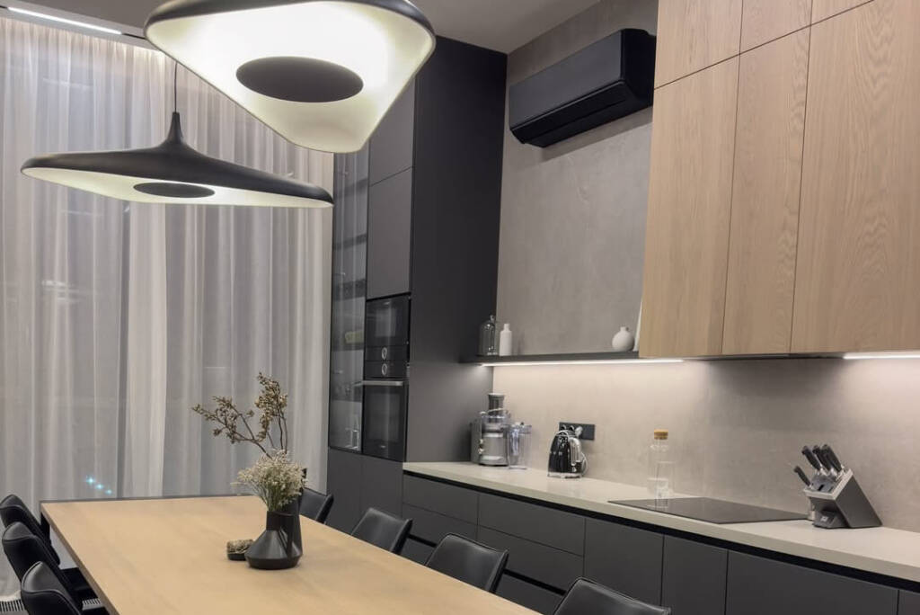 Освещение перерастает из необходимой функции в архитектурную основу всей кухни.